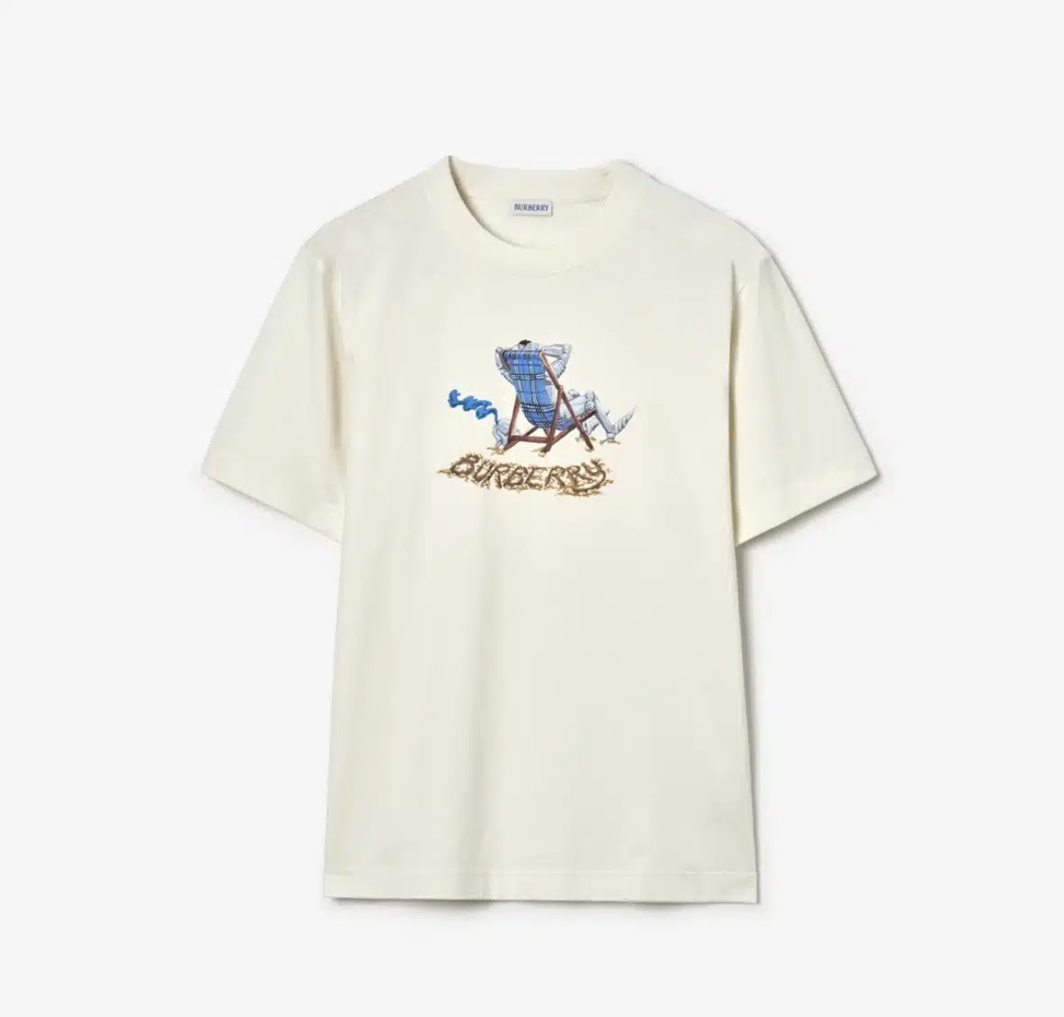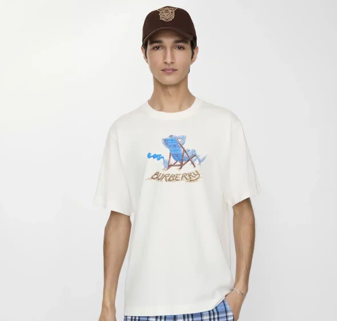 - A crew-neck T-shirt cut to a relaxed fit from midweight cotton jersey. The design is printed with hand-drawn artwork depicting our Equestrian Knight at the beach reclining on a Burberry Check deckchair.​