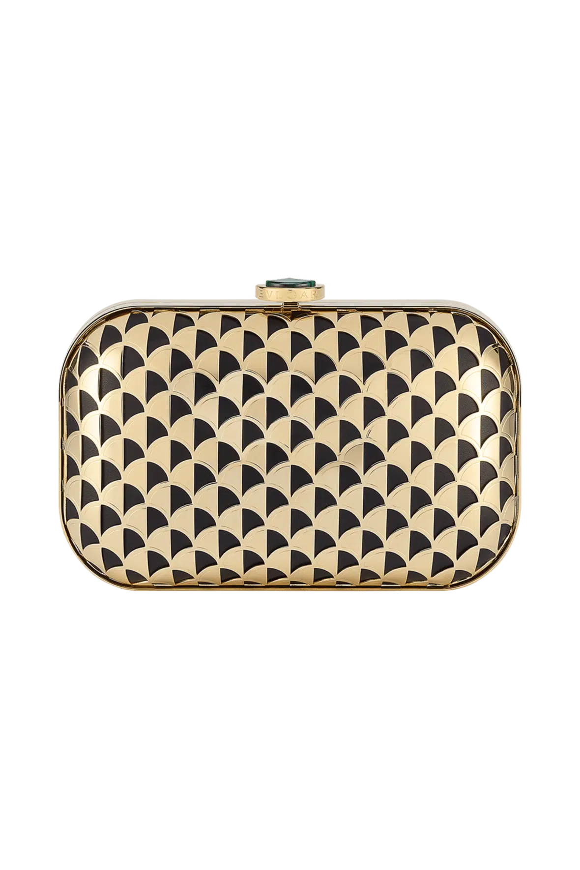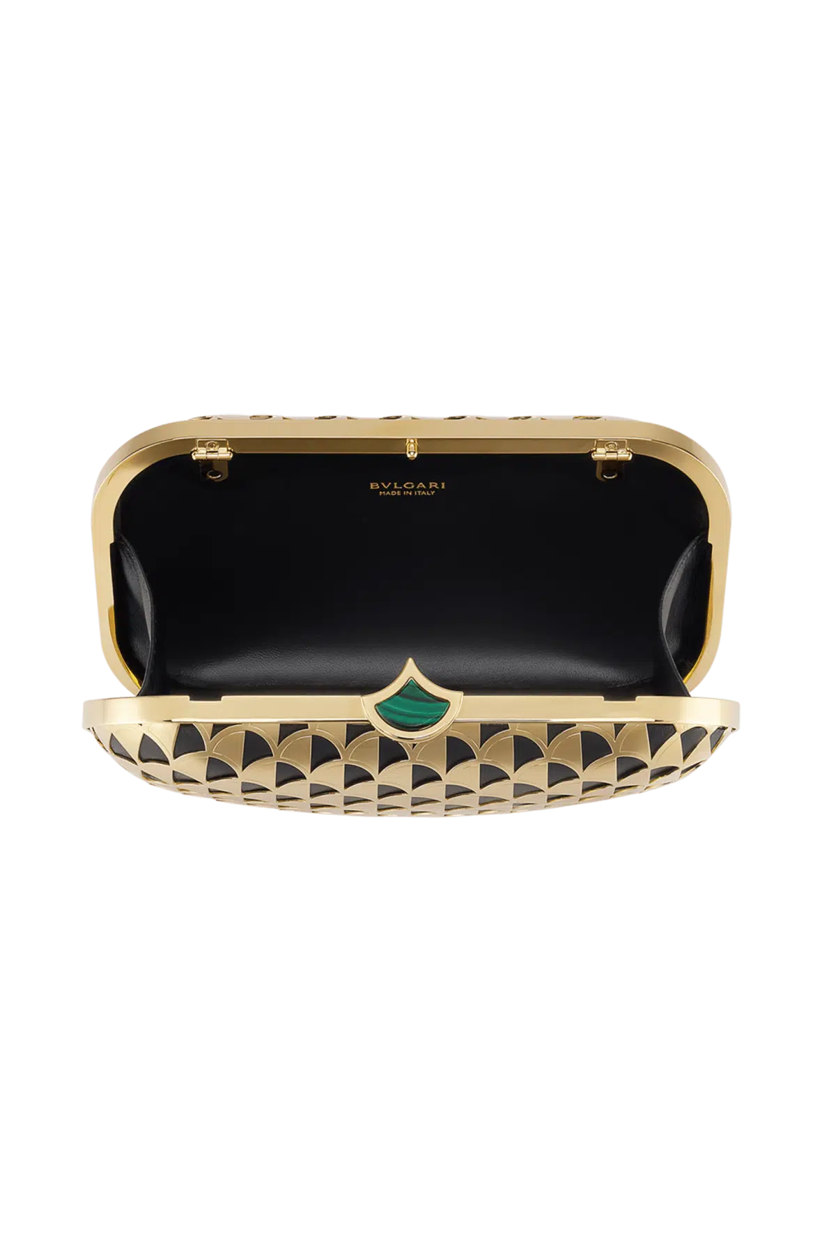 A refined blend of Roman inspiration and exceptional craftsmanship, the Divas’ Dream clutch is crafted in gold-plated metal, artfully laser cut into the distinctive Calla motif. In a captivating see-through effect, the black nappa leather lining offers an elegant contrast with the metallic mesh, while the iconic closure – enriched with a fan-shaped malachite insert – offers a distinctive detail. Featuring a single compartment, the model is complete with a snake body-shaped chain strap. 20 x 12 x 6.5 cm – 7.9 x 4.7 x 2.6 inches. Made in Italy