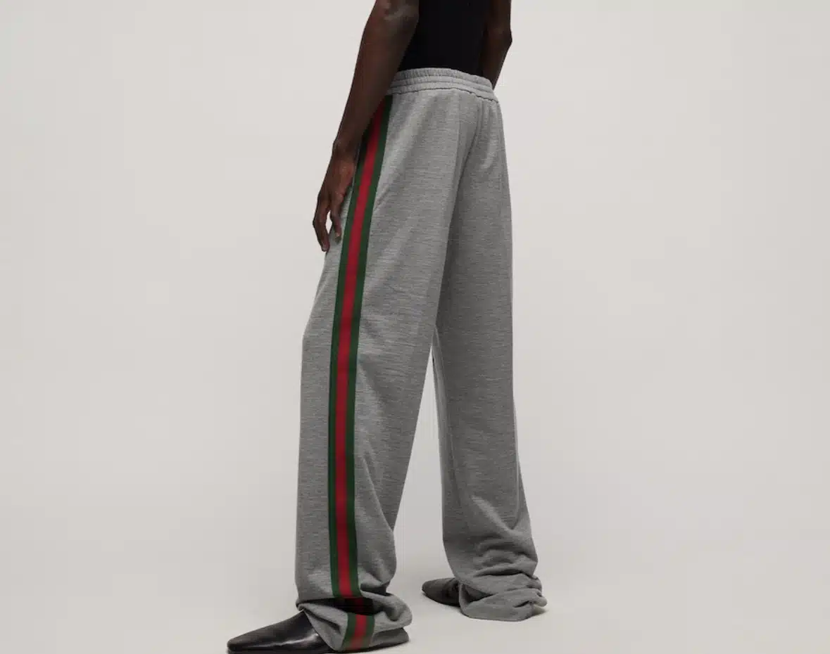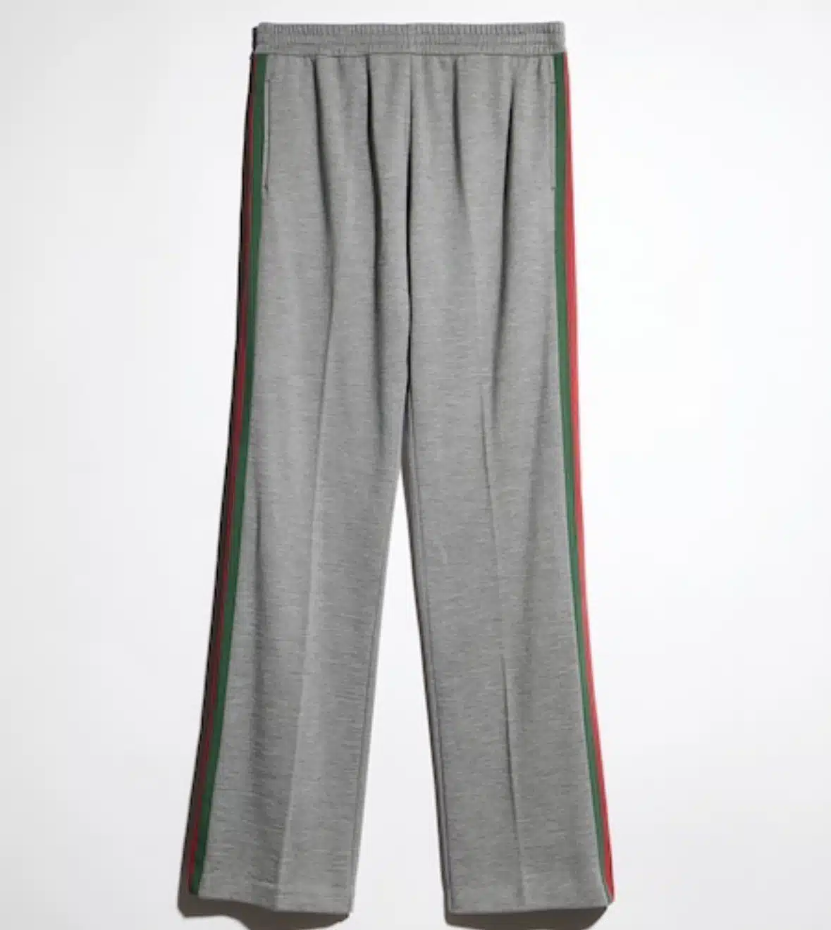 This style is part of the Gucci Primavera collection. These wide-leg sportswear pants are crafted from cashmere jersey, with Web jacquard at the sides. The elastic waistband features an adjustable drawstring, and welt pockets complete the streamlined silhouette.