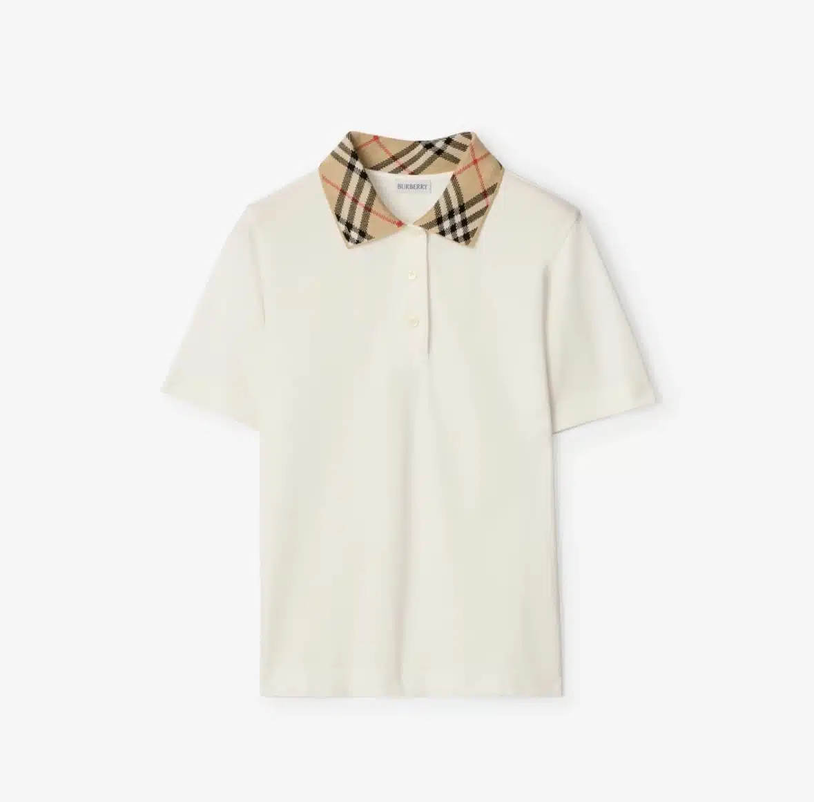 - A lightweight polo shirt in a soft cotton piqué, topped with a knitted Burberry Check collar in our signature sand beige. The style is cut to a regular fit and embroidered with a tonal Equestrian Knight Design.