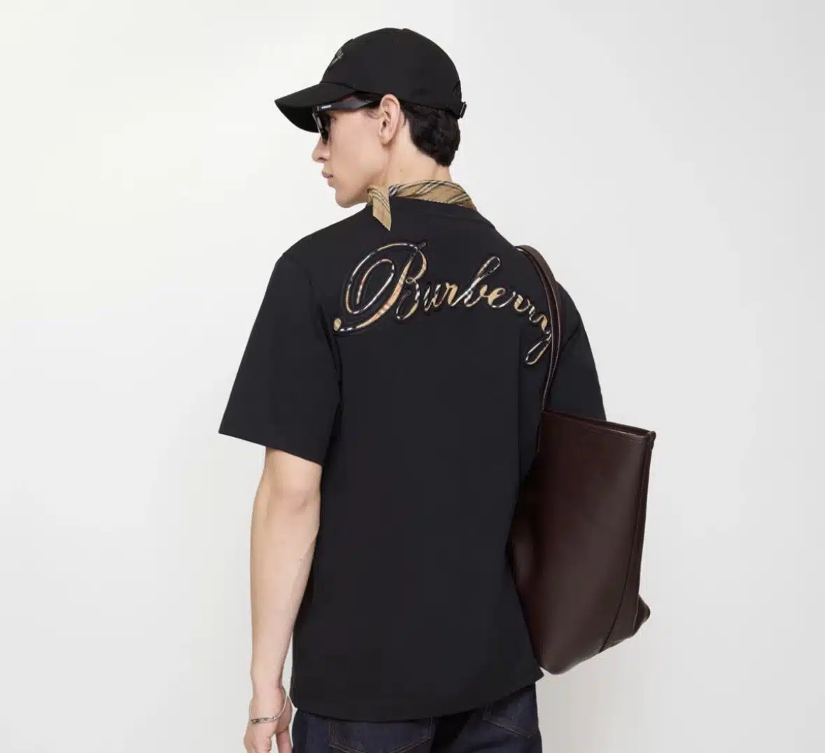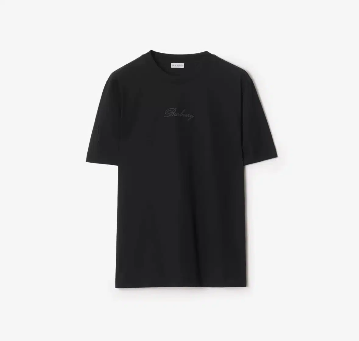 - A crew-neck T-shirt cut to a relaxed fit in midweight cotton jersey. The design features a cursive logo in chain-stitch embroidery filled with the Burberry Check.