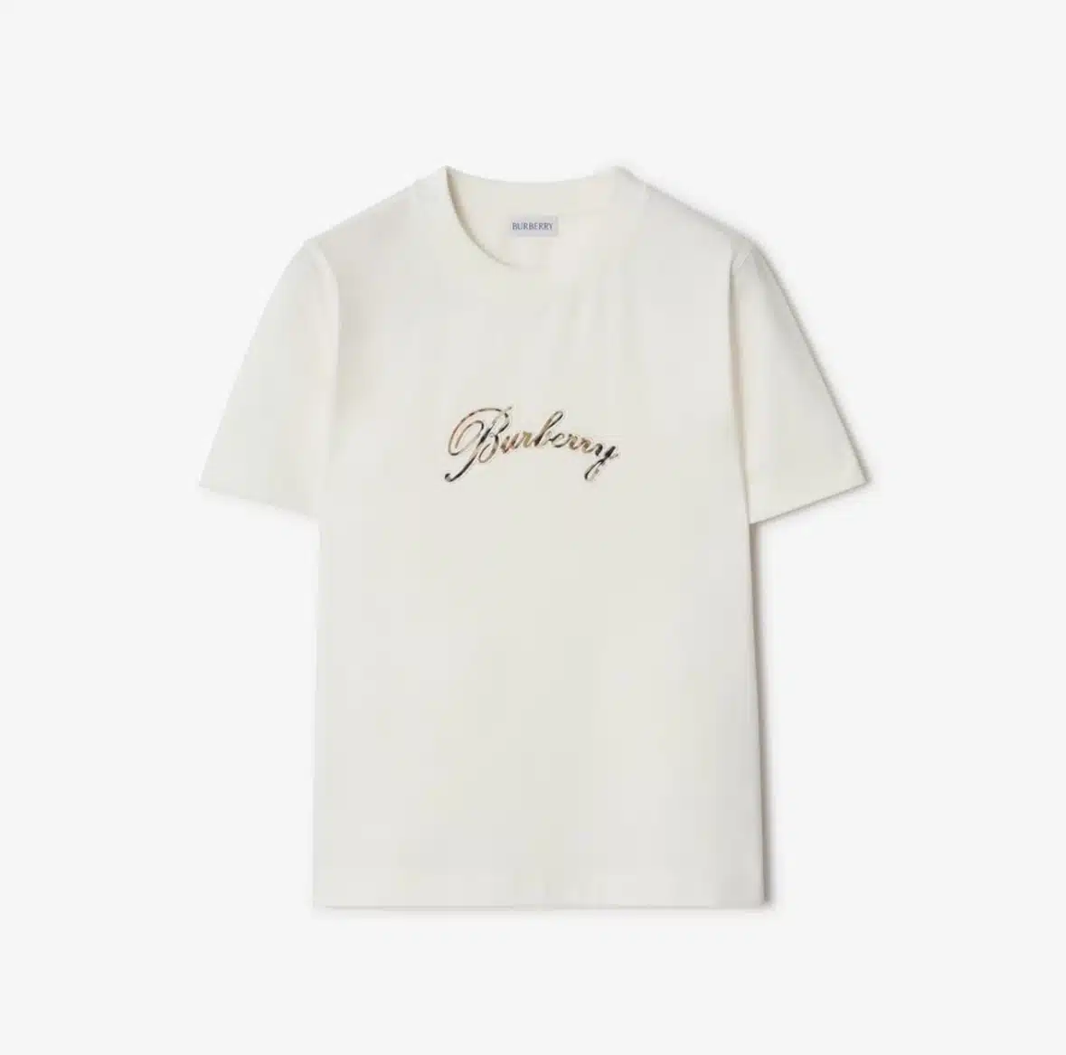 - A crew-neck T-shirt cut to a regular fit in lightweight cotton jersey. The design features a cursive logo in chain-stitch embroidery filled with the Burberry Check.