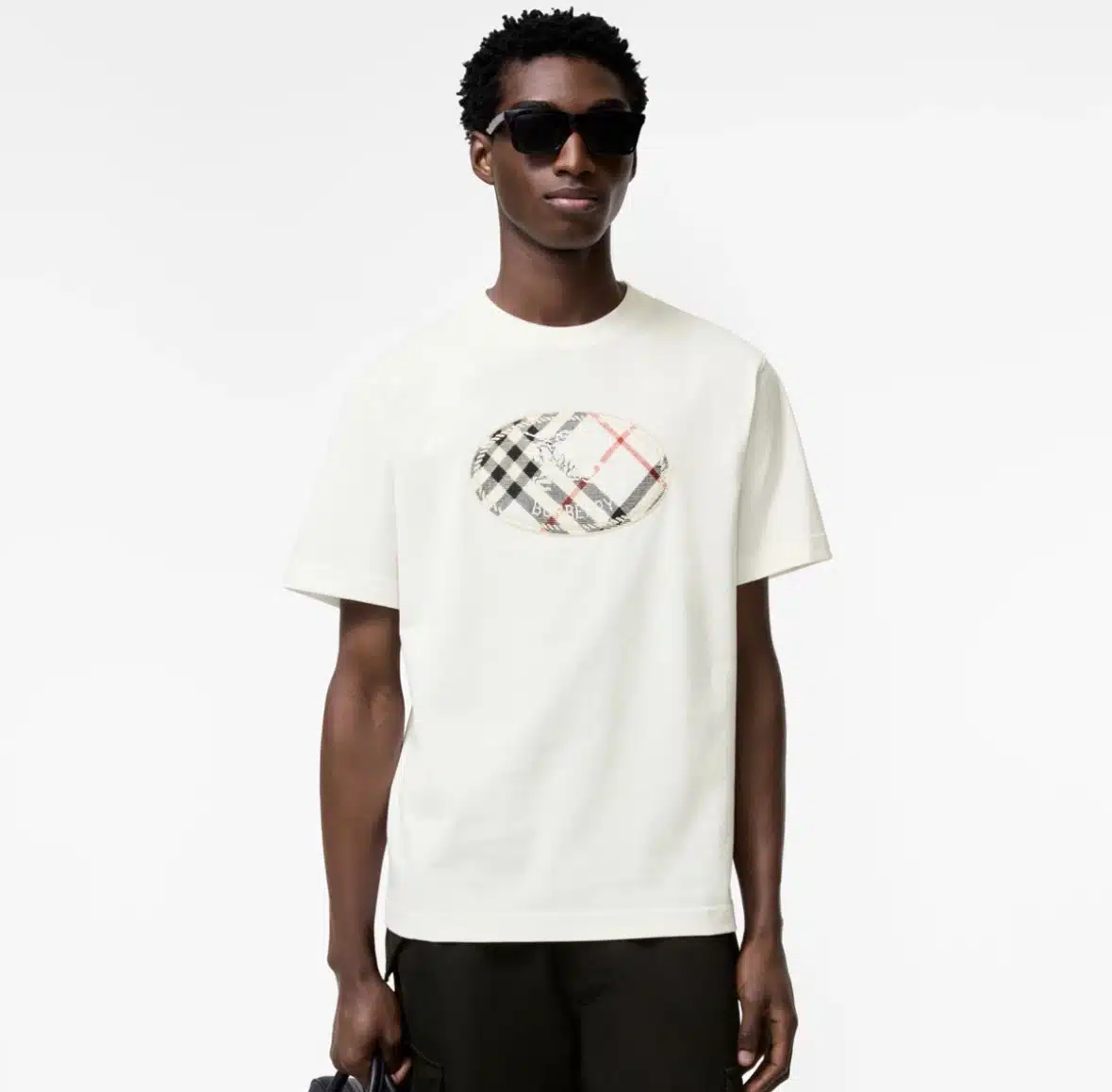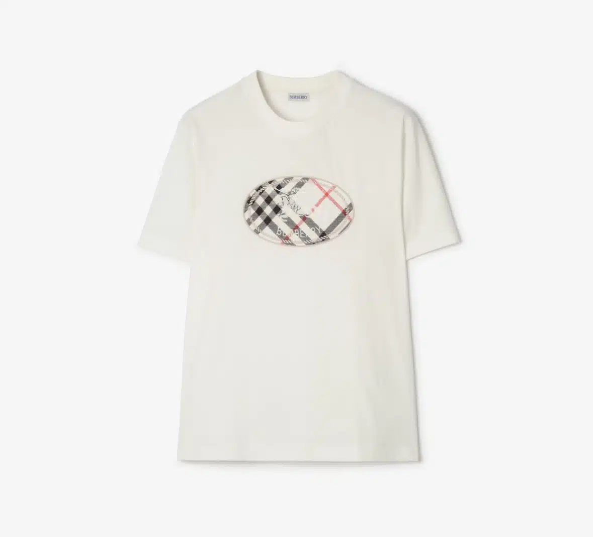 - A T-shirt in midweight cotton jersey, cut to a relaxed fit. The style is embroidered with our Knight stamp in a tonal Burberry Check – the archival motif was first seen on Burberry bags in the 1980s.