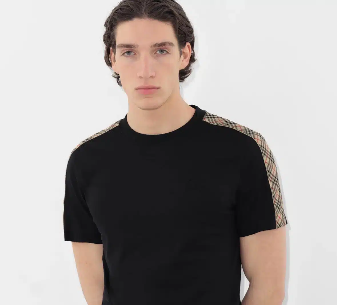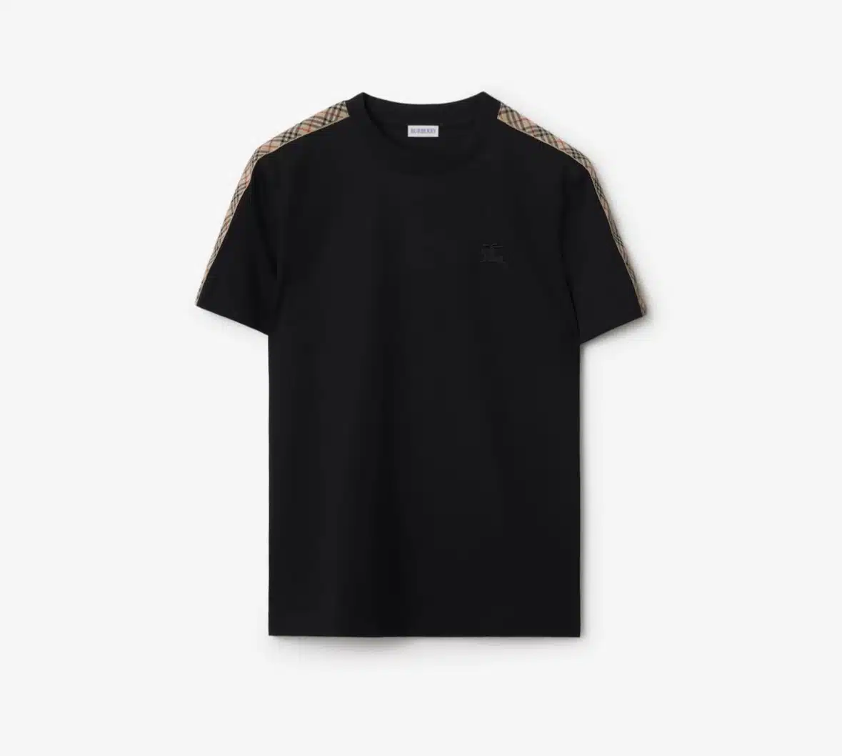 - A T-shirt in lightweight cotton jersey, cut to a slim fit. The style is embroidered with the Equestrian Knight Design and framed with Burberry Check taping at the sleeves.