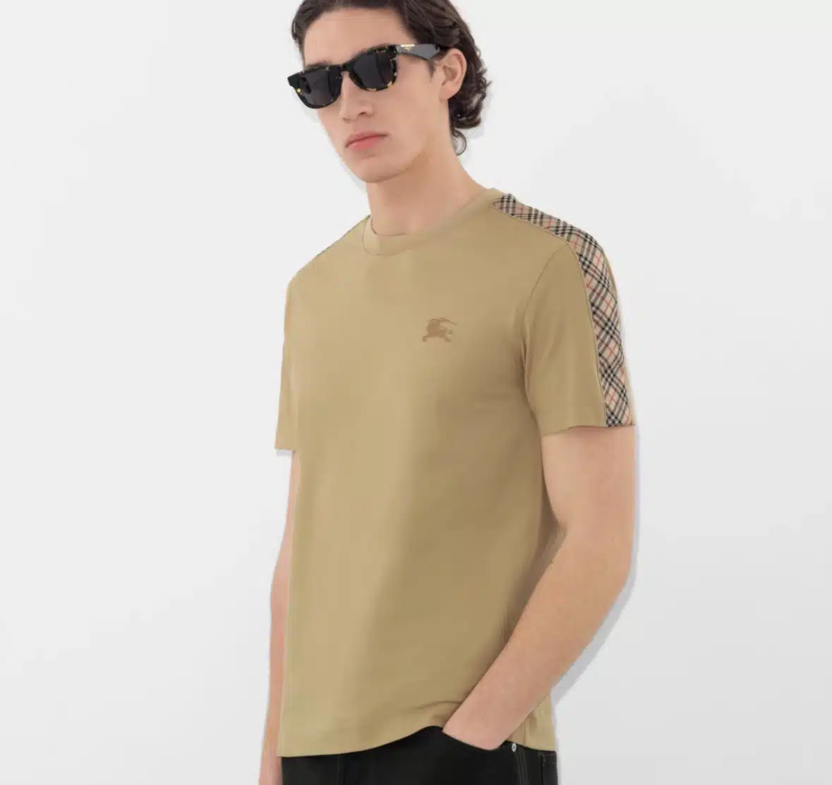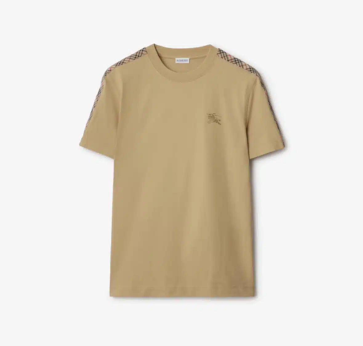 - A T-shirt in lightweight cotton jersey, cut to a slim fit. The style is embroidered with the Equestrian Knight Design and framed with Burberry Check taping at the sleeves.
