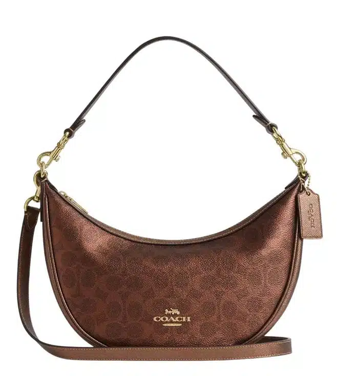 Coach copper aria medium shoulder bag crafted in coated canvas and leather featuring zip closure, 1 compartment, inside slip pocket, logo printed, removable shoulder and crossbody straps. Products purchased from darveys are supported exclusively by the warranty/exchange policies of darveys and its partner boutiques. Brand owners and their channel partners are not responsible for exchange/warranty services for items purchased through darveys.