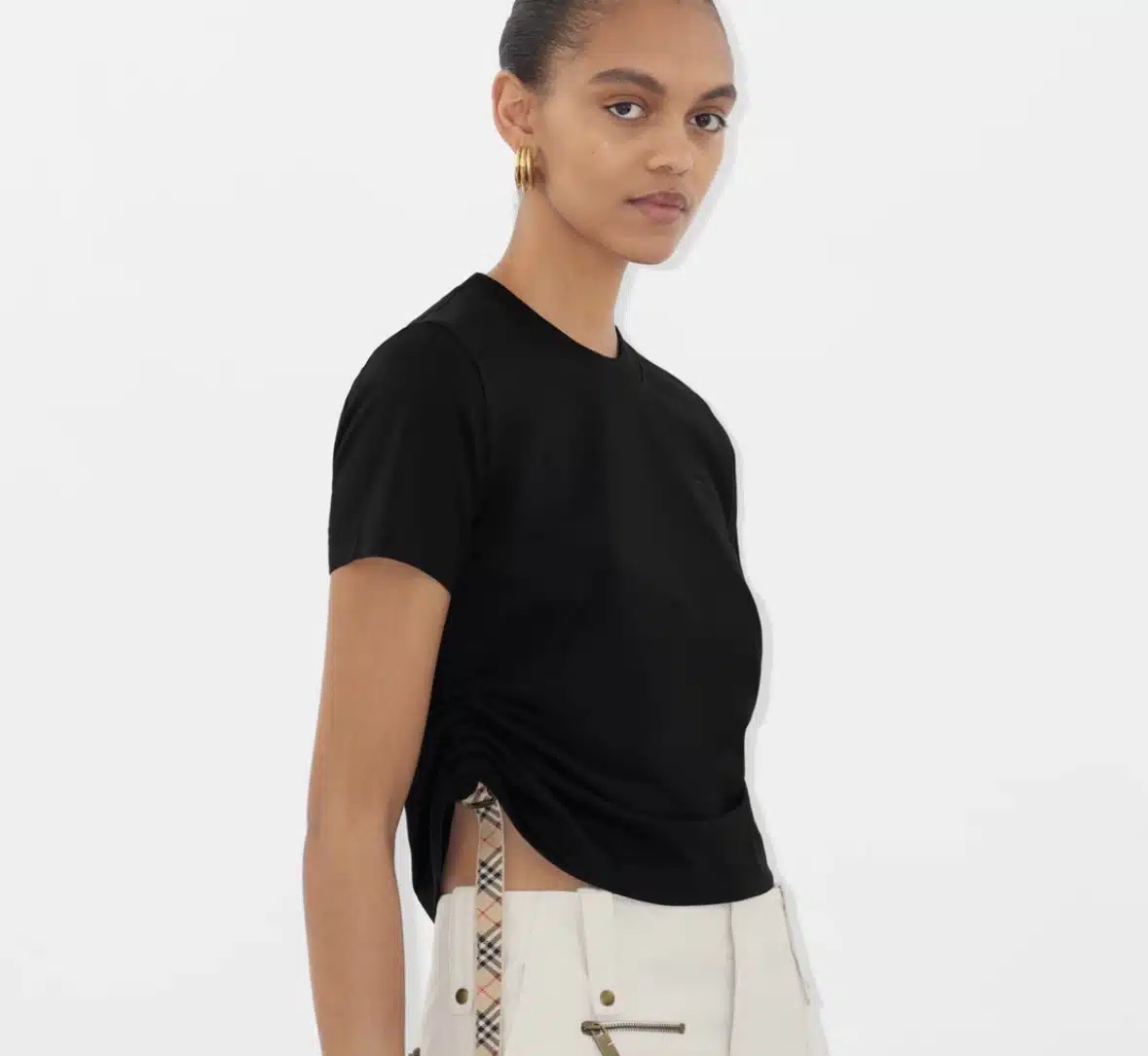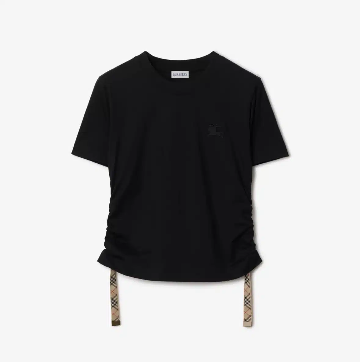 - A T-shirt in lightweight cotton jersey, cut to a regular fit and embroidered with a tonal Equestrian Knight Design. The ruched sides can be adjusted with the Burberry Check side straps and B buckles.