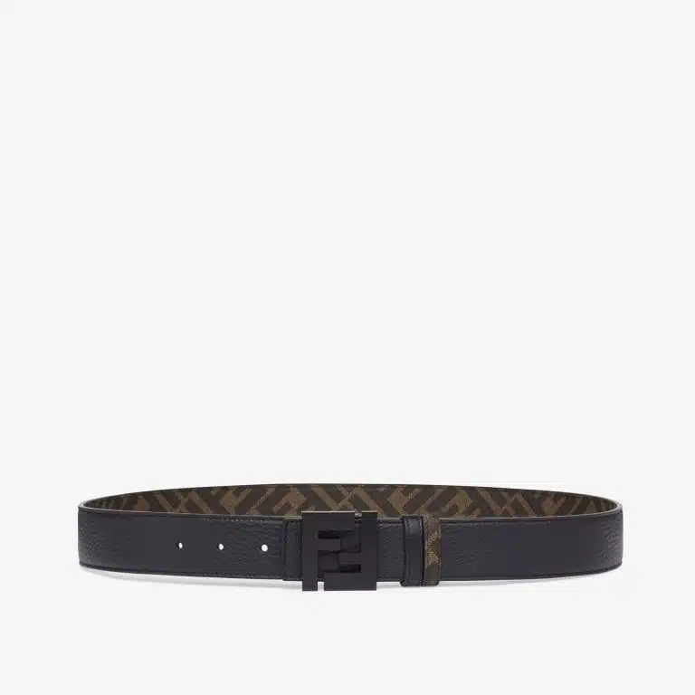 Reversible belt with two loops. Iconic FF stud buckle. Made of black Cuoio Romano leather. Reverse side in fabric with tobacco and black FF motif. Black enamelled metalware.