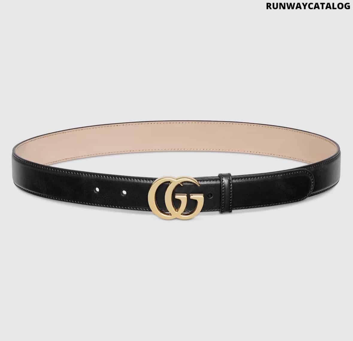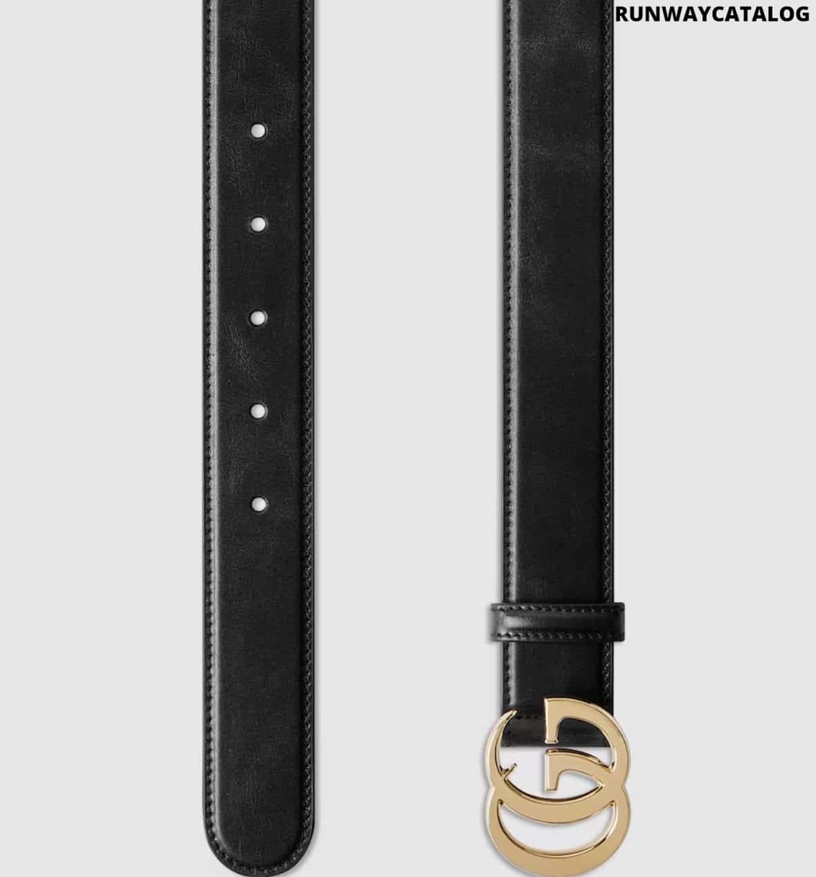 Introducing Spring Summer 2026. Women’s belts reinterpret the Double G buckle with a sleek, flat profile, highlighting one of the House’s signature motifs. This GG Marmont belt has been crafted in black leather with gold-toned hardware