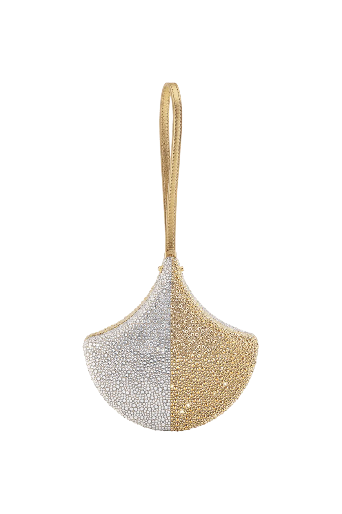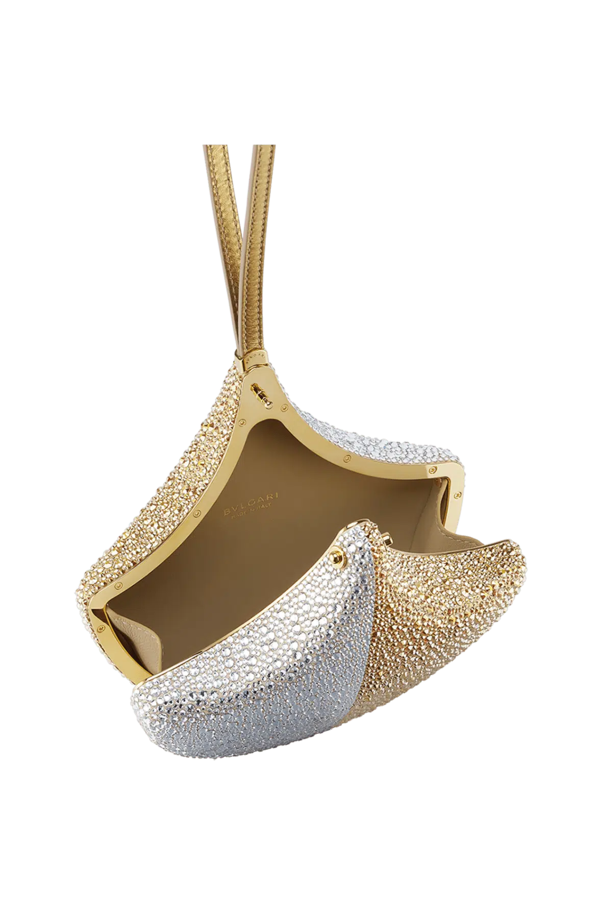 Masterfully crafted in suede and covered with hand-applied silver and champagne gold Neige Pavé Crystals, the Ginkgo clutch is a sparkling celebration of the refined Calla motif – inspired by the mosaics of the Baths of Caracalla – in its purest form. A unique blend of Roman inspiration and iconic design, exquisite leather goods craftsmanship and jewellery-making savoir faire, the evening bag is elegantly suspended from a leather bracelet and features a single compartment. 16 x 16.5 x 5 cm – 6.3 x 6.5 x 2 inches. Made in Italy
