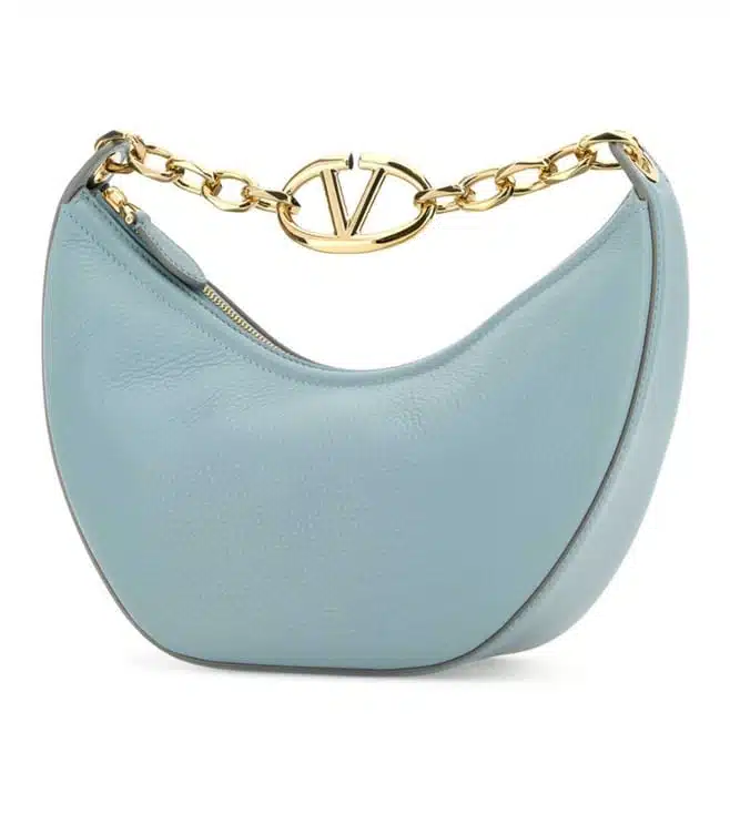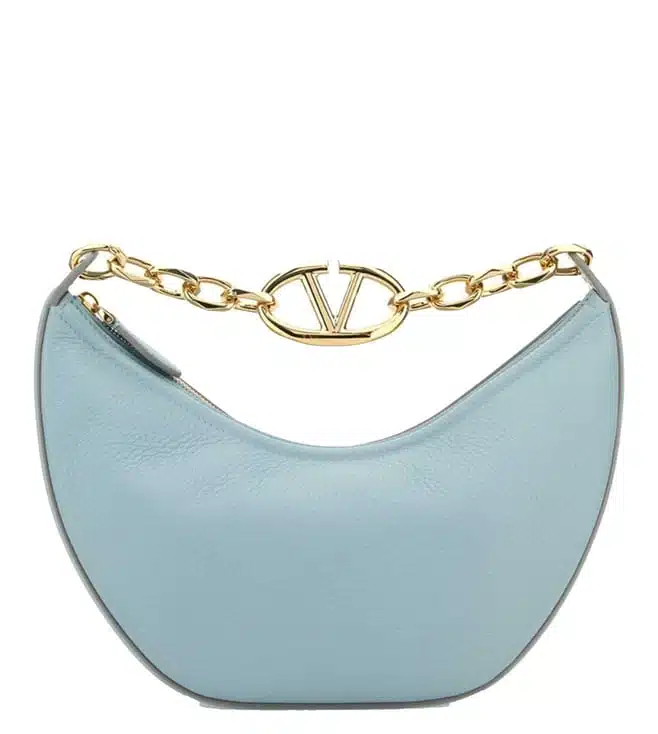 Light blue calf leather bag, grained texture, top zip fastening, a single chain-link top handle and an adjustable, detachable shoulder strap, vlogo signature and a debossed logo at the front. The main compartment includes an internal card slot and debossed logo. Products purchased from Darveys are supported exclusively by the warranty/exchange policies of Darveys and its partner boutiques. Brand owners and their channel partners are not responsible for exchange/warranty services for items purchased through Darveys.