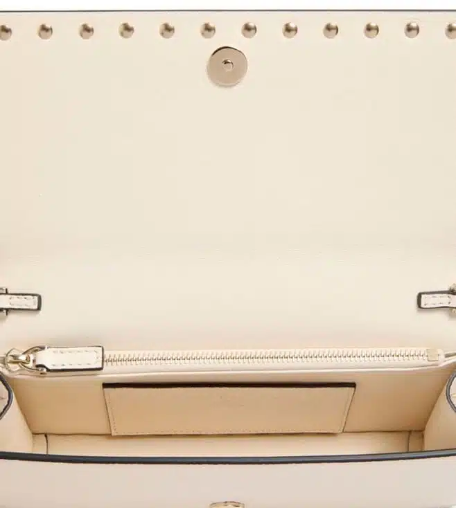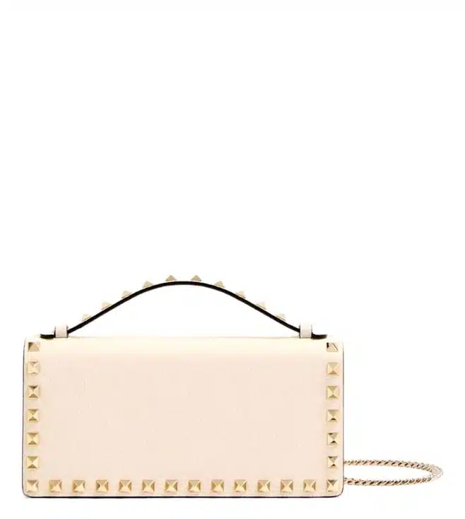 Light ivory rockstud crossbody bag, magnetic closure, 1 compartment, internal wall pocket with zipper closure and a card slot, studded pattern, top handle with removable chain crossbody strap. Products purchased from Darveys are supported exclusively by the warranty/exchange policies of Darveys and its partner boutiques. Brand owners and their channel partners are not responsible for exchange/warranty services for items purchased through Darveys