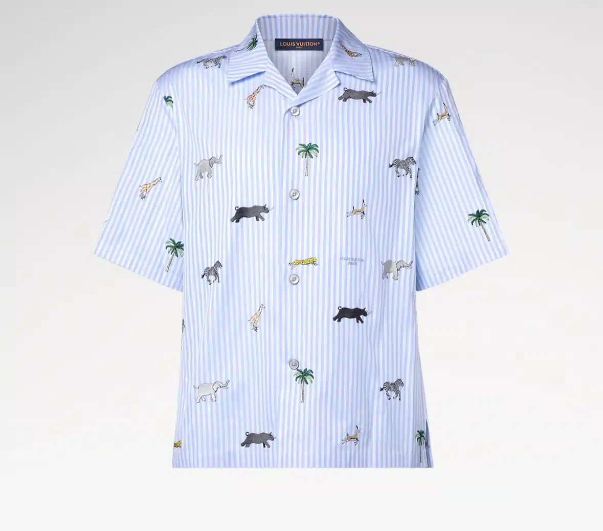 This pale blue and white striped short-sleeved shirt is embellished with the LV x The Darjeeling Limited motif from the Spring-Summer 2026 show. Nostalgic allover embroideries of flora and fauna celebrate the art of travel, while embroidered Louis Vuitton Paris lettering discreetly signs the front. Matching shorts make a crisp and summery set.I’m