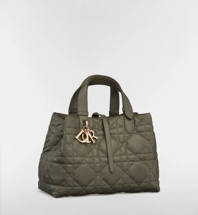 The Dior Toujours bag is distinguished by a casual and practical design. Crafted in olive taupe calfskin with Macrocannage topstitching, the style showcases a spacious interior compartment with a matching pouch to organize the essentials. Its thin leather strap closure keeps items secure while the D of the CD Lock clasp twists to alter the sides and enhance the bag’s silhouette. The leather top handles can be adjusted using the small notches to allow the medium bag to be carried by hand or worn over the shoulder.
