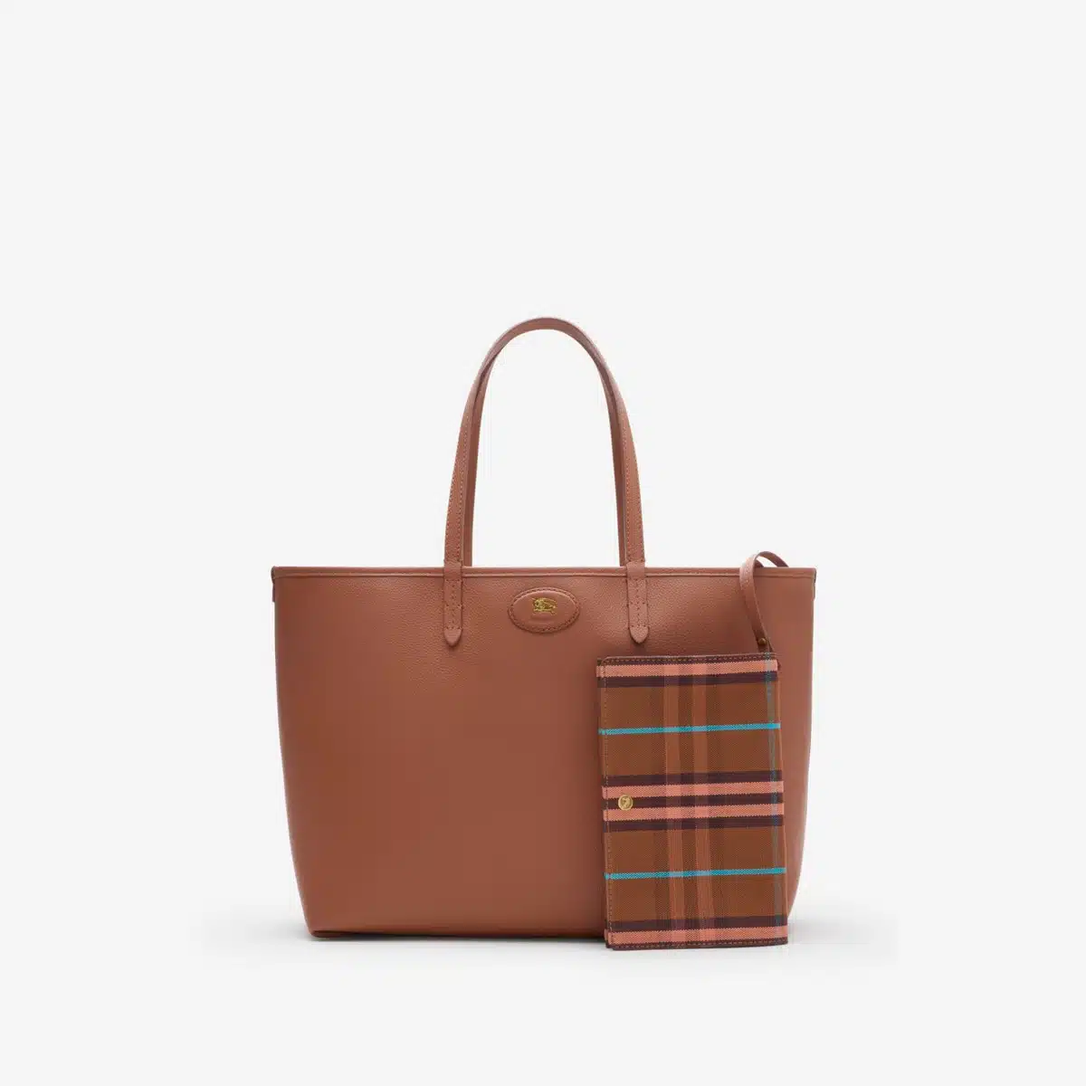 - A spacious tote made in Italy from grainy calf leather, reversing to a Burberry Check cotton linen blend in seasonal gingerbread brown. The Bloomsbury collection is finished with a leather and metal Knight stamp, an archival motif first seen on Burberry bags in the 1980s. Comes with a detachable press-stud pouch to secure smaller items.