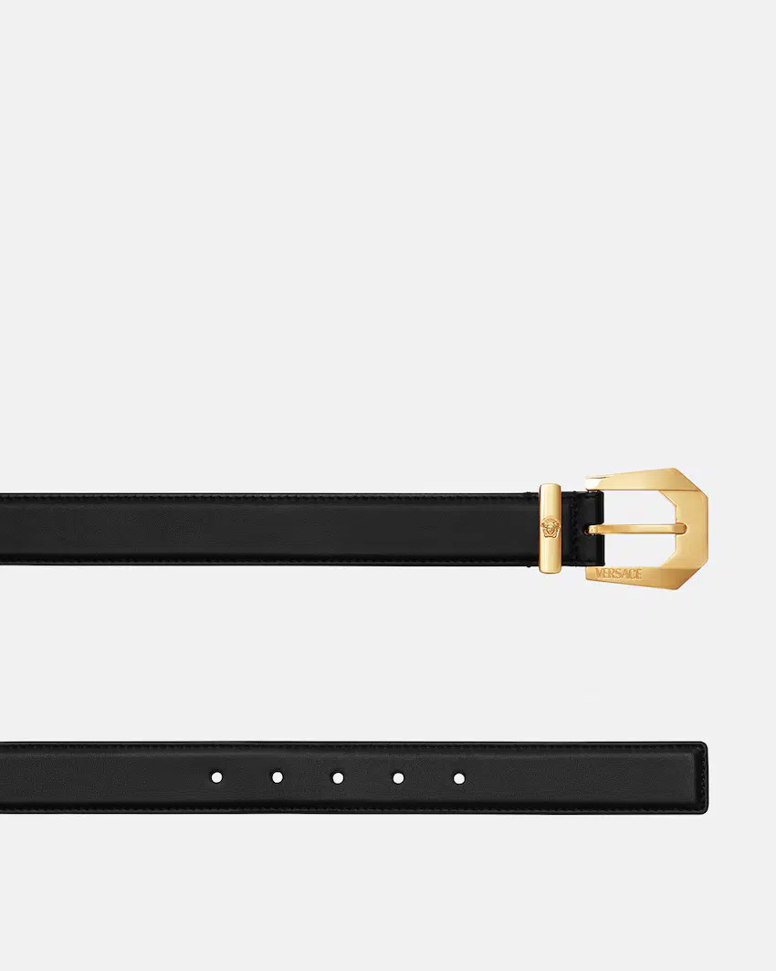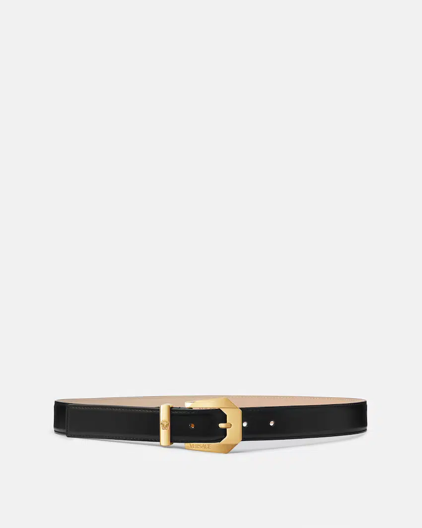 Smooth leather belt featuring the Medusa Heritage buckle with accent belt loops.