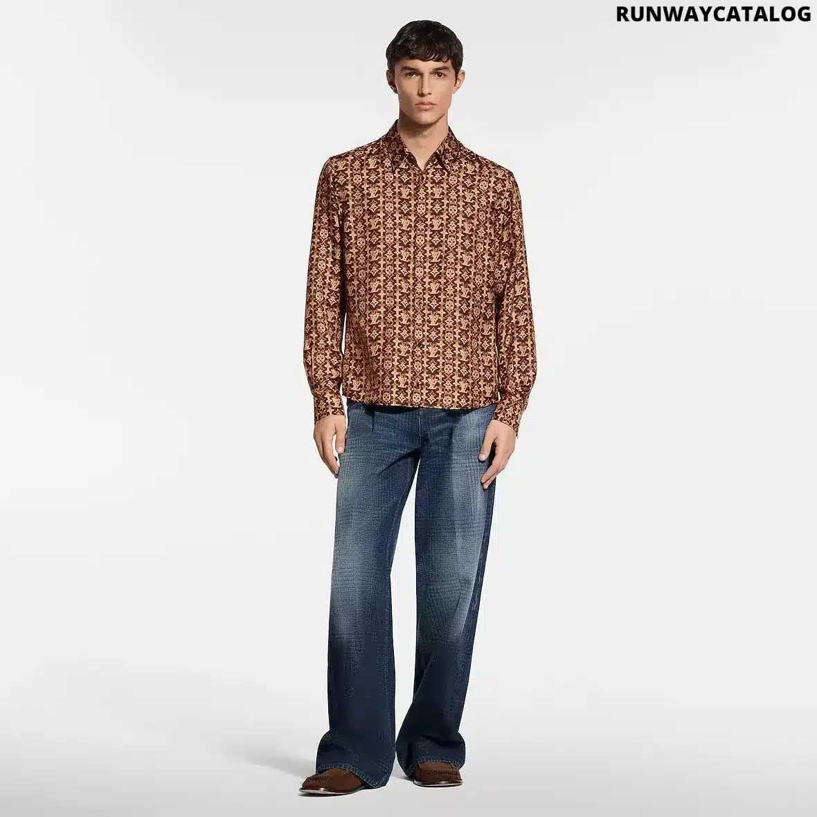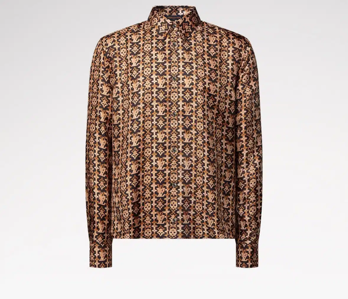 This fluid shirt is crafted from pure organic silk in rich brown Louis Vuitton heritage tones. It features a graphic allover Monogram Overlap motif from the Spring-Summer 2026 show and is finished with lustrous tiger’s eye quartz-like buttons. This luxurious piece brings an elevated signature accent to a look.