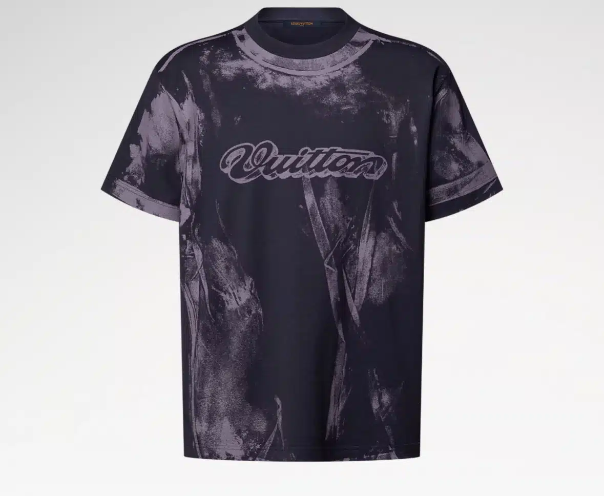 This organic cotton T-shirt has a playful allover trompe l’oeil print of another superimposed T-shirt with a bleached and crumpled look. A printed cursive Vuitton signature lends a graphic accent to the front, while a woven Marque L.Vuitton Déposée label signs the back. This piece adds a bold twist to casual looks