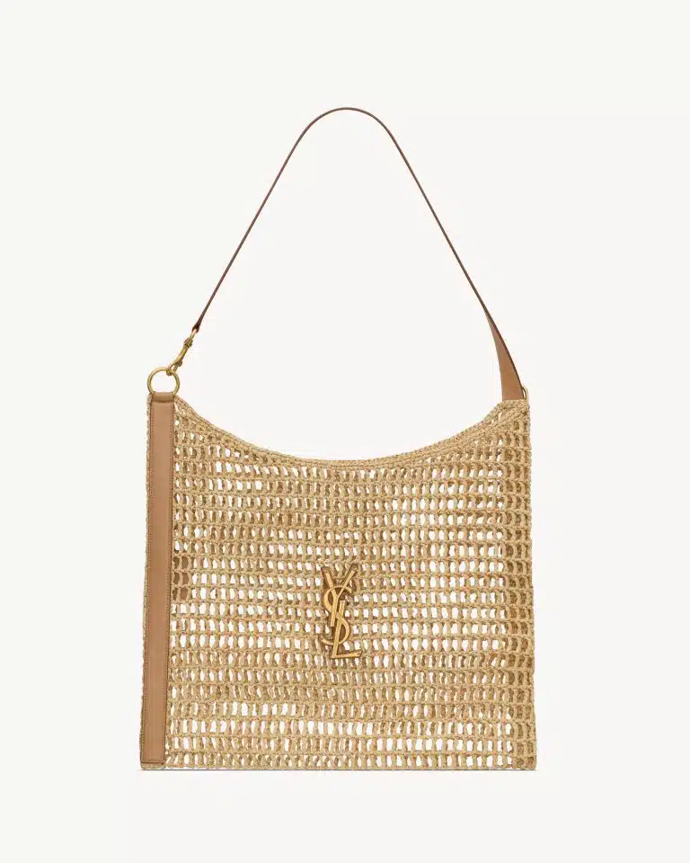 HANDCRAFTED CROCHET NET SHOULDER BAG DECORATED WITH THE CASSANDRE, FEATURING A DUAL-LENGTH SHOULDER STRAP
