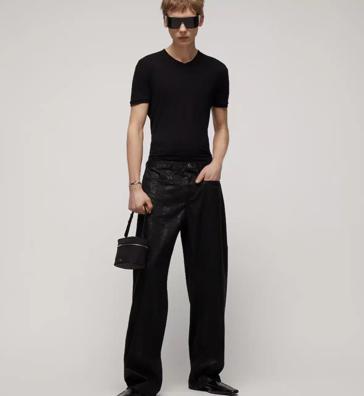 This style is part of the Gucci Primavera collection. These straight‑leg denim pants combine an allover laminated python print with a tailored attitude. The design replaces the classic 5-pocket construction with front welt pockets and a functional back yoke that doubles as back pockets. The leather label is positioned to allow a belt to be worn effortlessly on this style