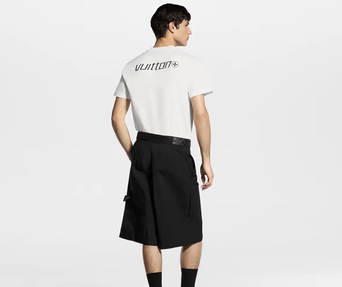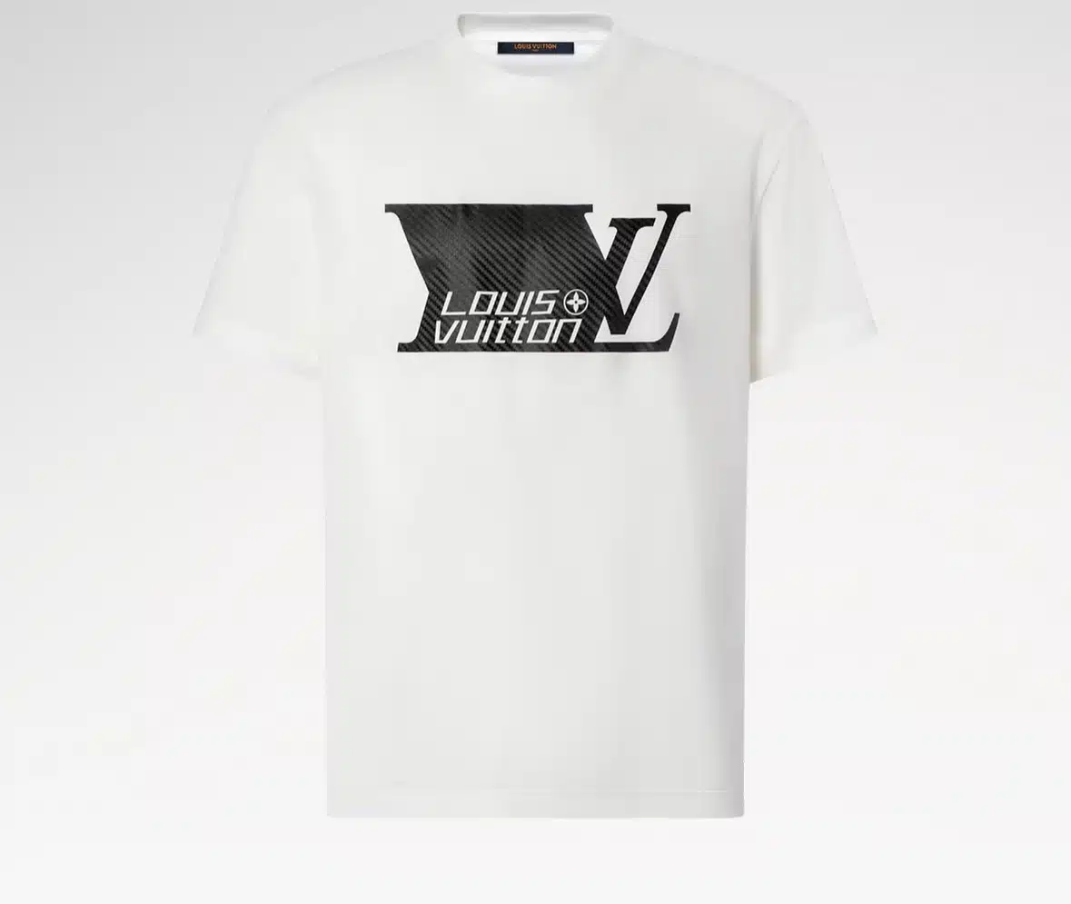 Graphic signatures adorn this classic white T-shirt in light cotton jersey. A black LV Sprinter motif on the front is printed with a textured trompe l’oeil carbon fiber effect. Vuitton lettering with a Monogram Flower is printed with the same technique on the back. This technical-looking piece can be layered to great effect with this season’s black silhouettes.