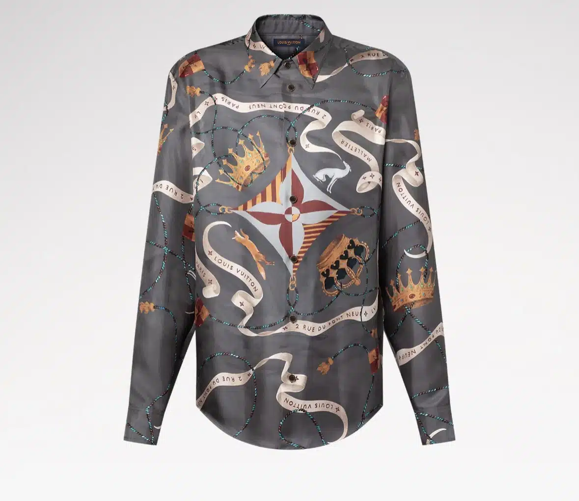 This fluid shirt crafted from pure silk is adorned with this collection’s regal LV Emblem motif. The graphic print on a dark gray base features fluttering ribbons incorporating House signatures, crowns, Monogram Flowers, a pedigree dog and a playful fox. This vibrant and sophisticated piece is perfect for festive evening looks