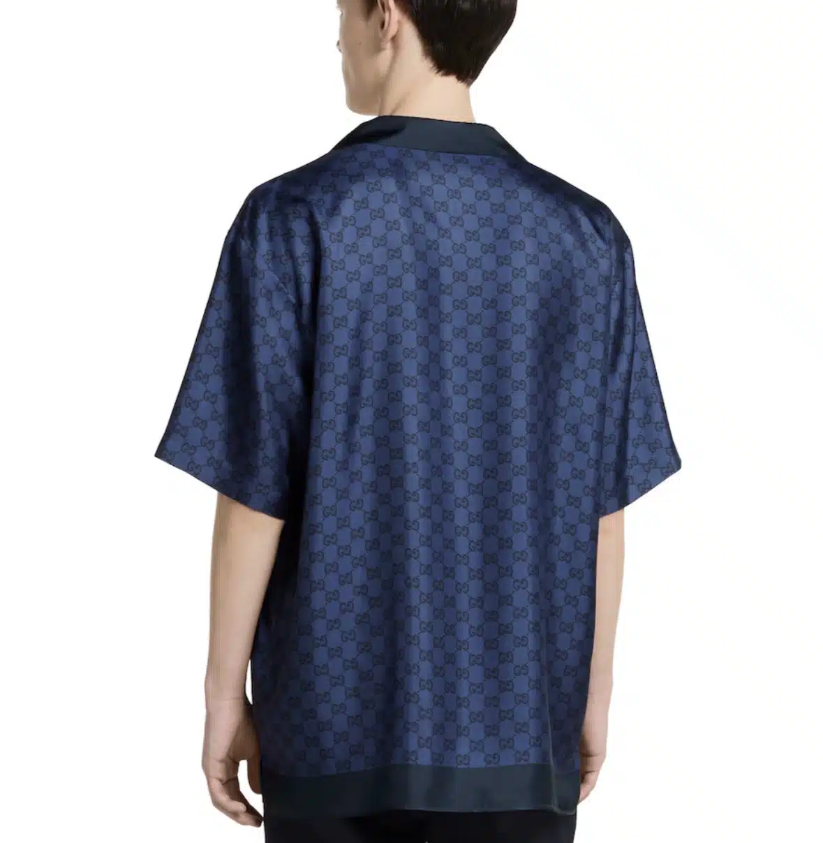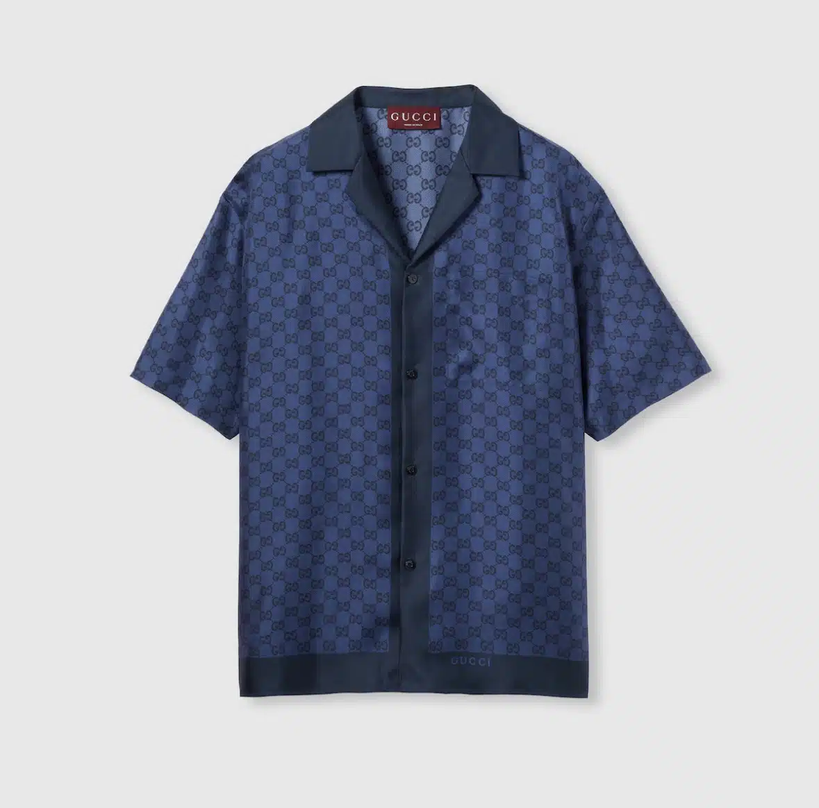 Gucci’s House codes continue to evolve for the new season. Crafted from blue silk twill, this regular fit shirt features an allover GG print.
