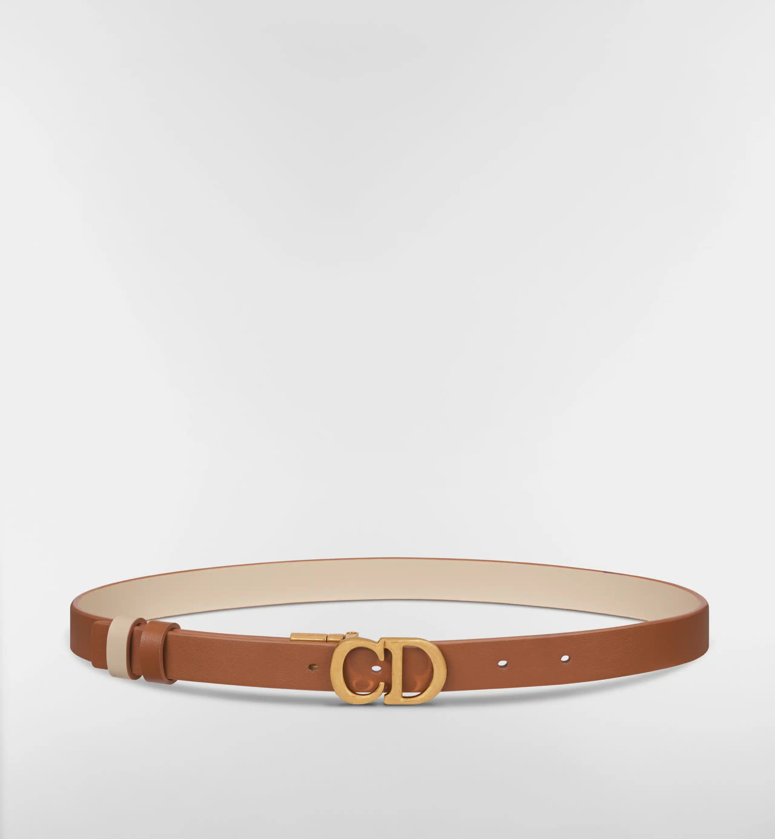The Saddle belt has become a Dior icon and a wardrobe classic. It is offered in a reversible variation, thanks to its swivel feature. Crafted in golden saddle smooth calfskin on one side and caramel beige on the other, it is embellished with the antique gold-finish metal CD buckle. The design also features two removable loops that can be worn in a tonal or contrasting fashion. The timeless accessory elegantly highlights the waist and will coordinate well with jeans, a skirt or a dress.