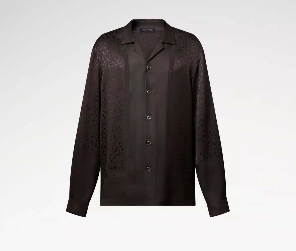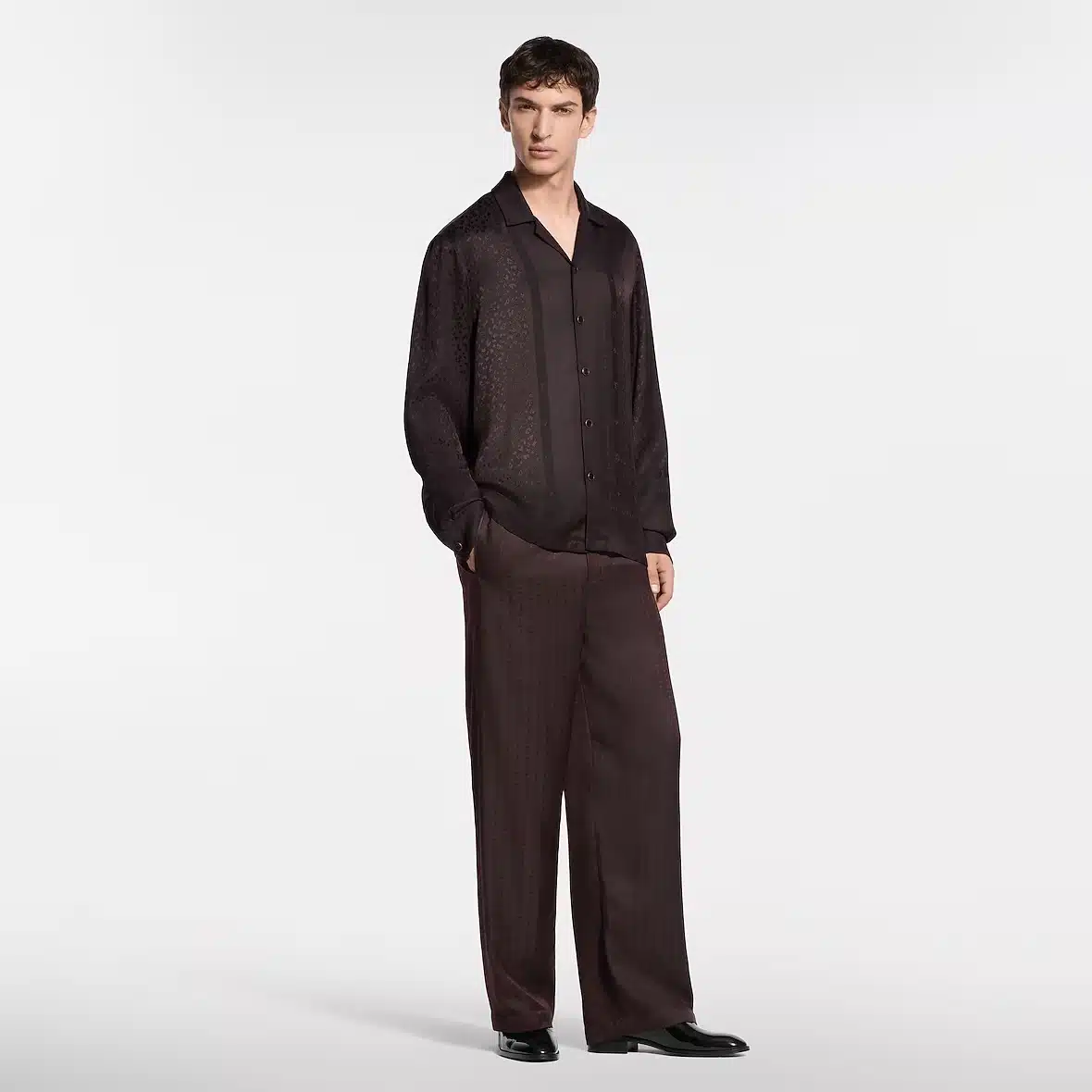 Richly embellished like a scarf, this fluid silk-blend pajama shirt in rich brown tones is elevated with this collection’s LV Cheetah jacquard, with discreet Monogram signatures integrated into the graphic feline pattern with a lustrous play of textures. The flowing, relaxed silhouette makes a comfortable and chic evening set paired with matching pants.