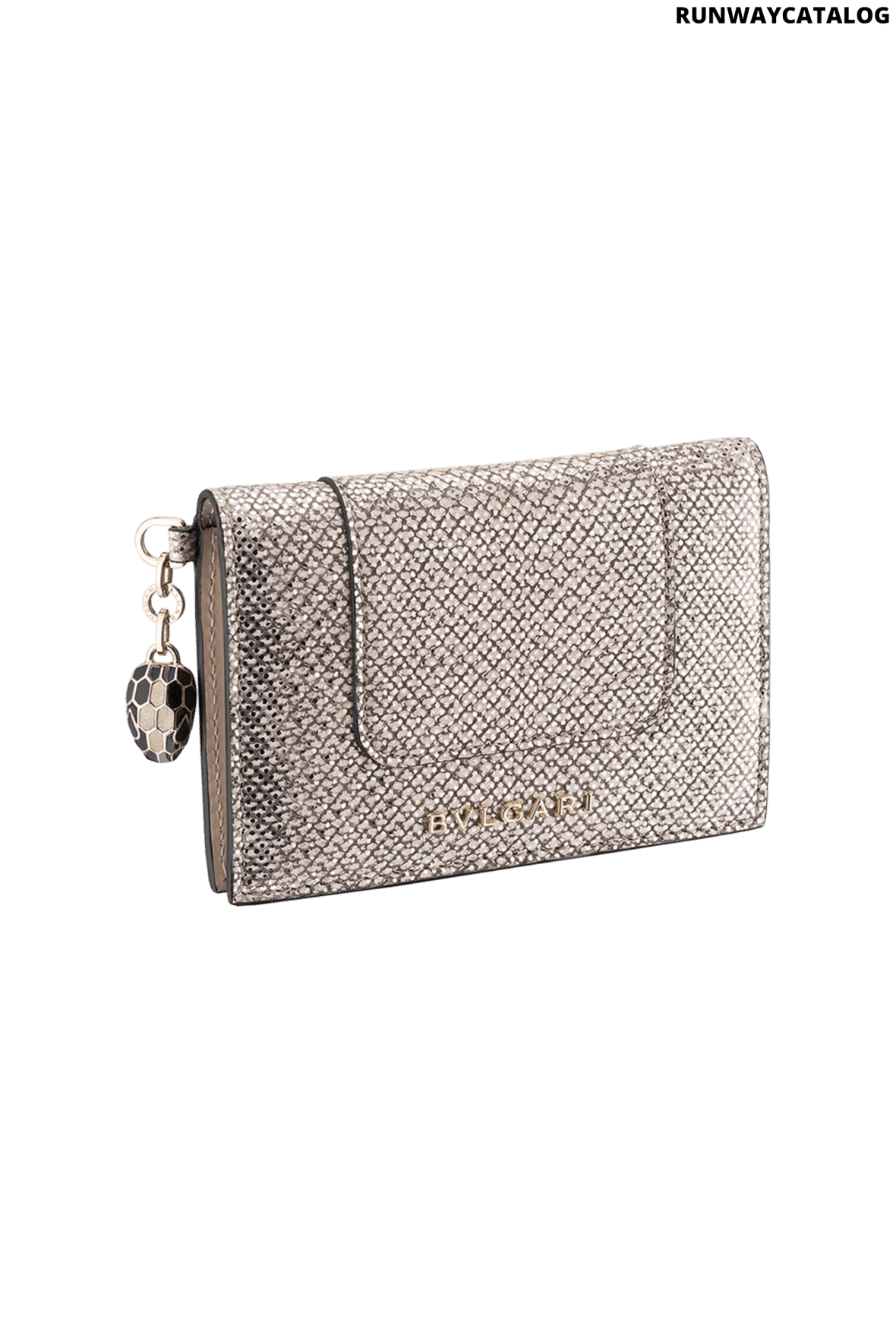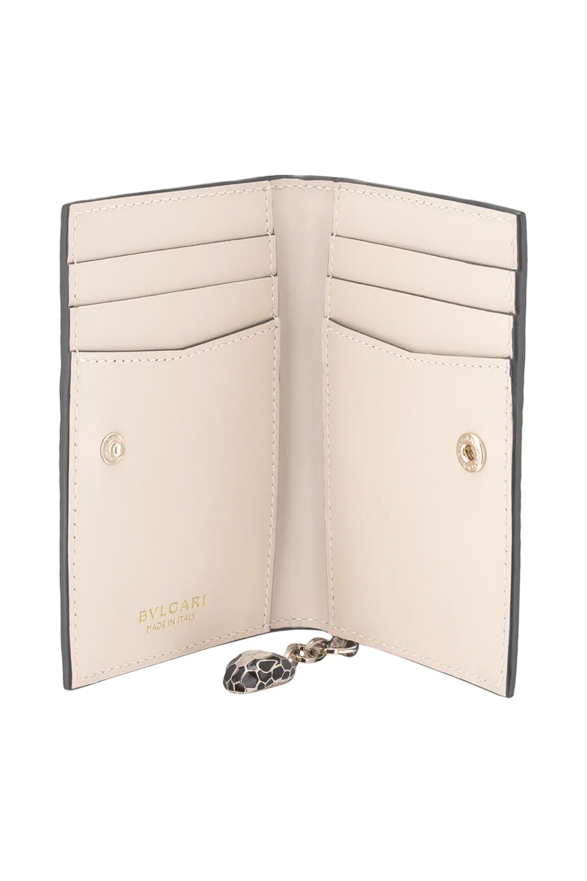 Crafted in milky opal beige metallic karung skin outside and milky opal beige calf leather inside, the Serpenti Forever folded card holder boasts the iconic snakehead charm whose hypnotic coloured scales and mesmerizing design draw from the Serpenti jewels of the 60’s. The model is completed by a press button closure, six credit card slots, two flat pockets and the Bvlgari metal logo on the back. 8 x 11 x 1 cm – 3.1 x 4.3 x 0.4 inches. Made in Italy.