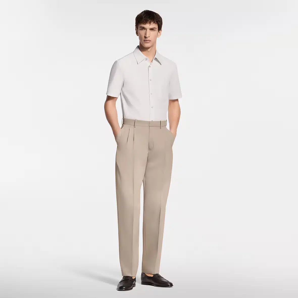 This ivory-toned short-sleeved shirt is a fresh option for warmer days. The fine, organic cotton is adorned with a jacquard LV Interlocked motif. Additional signature details include an LV button on the collar and woven signature labels on the button placket and the back. This piece can be paired with a suit in the same motif