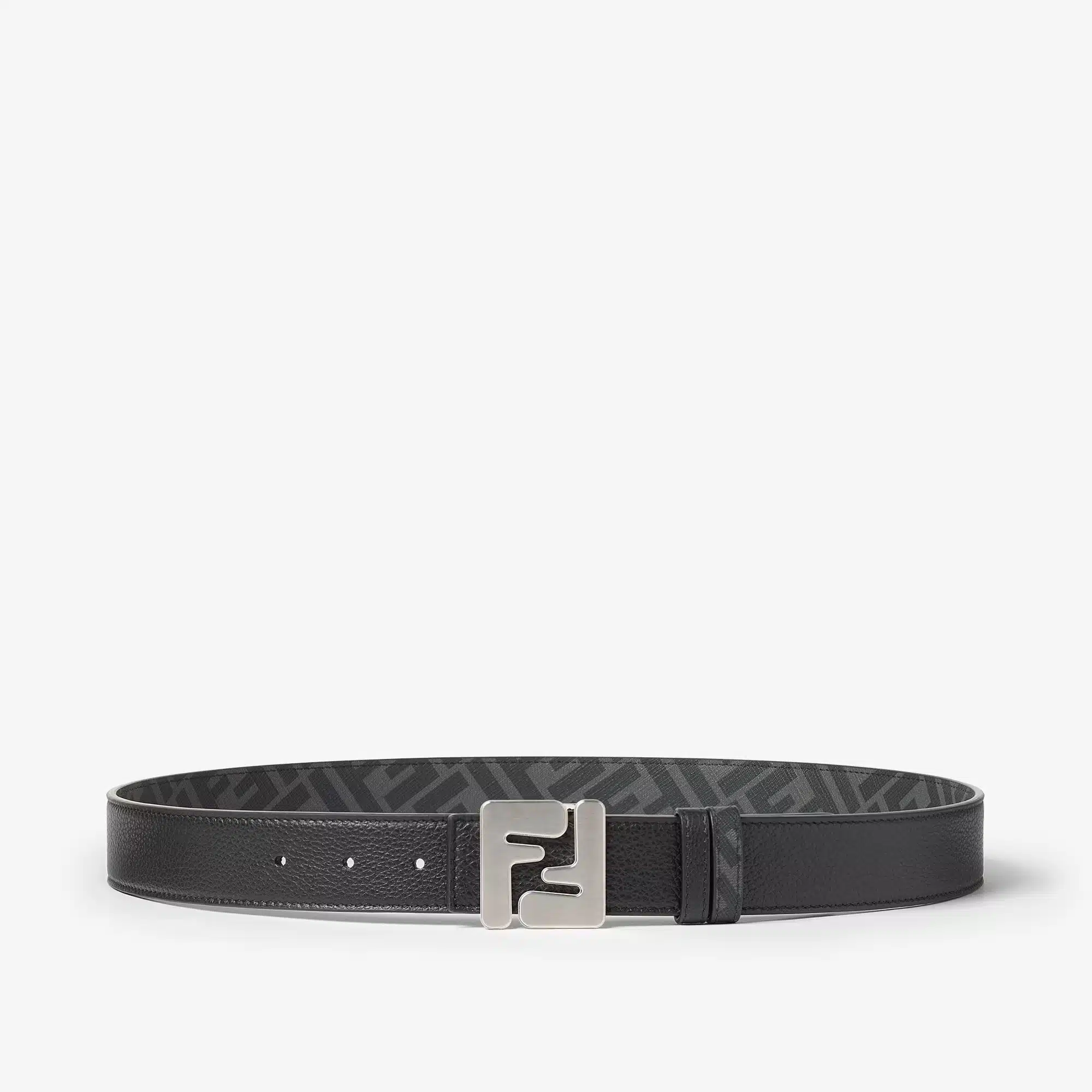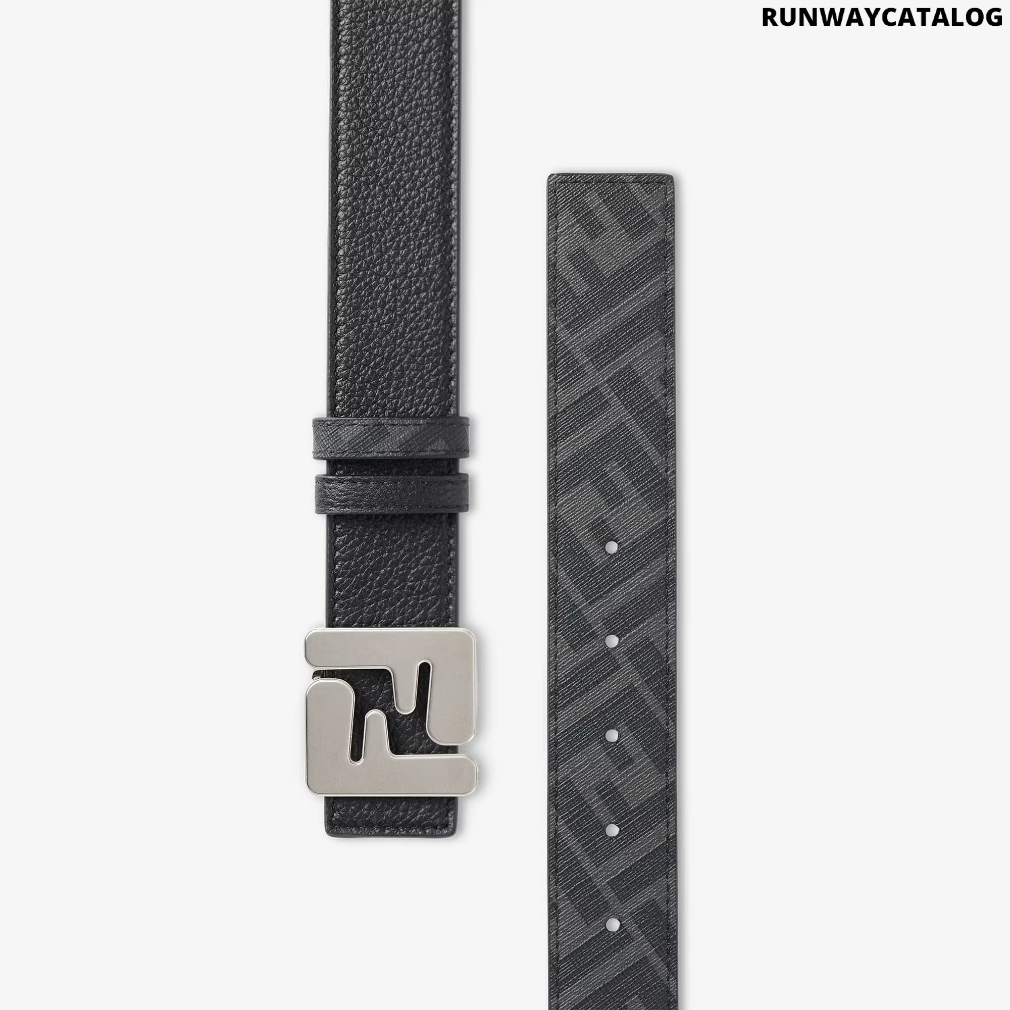 Reversible belt. Iconic FF stud buckle. Made of black leather. Black and grey FF canvas lining. Brushed palladium-finish metalware.