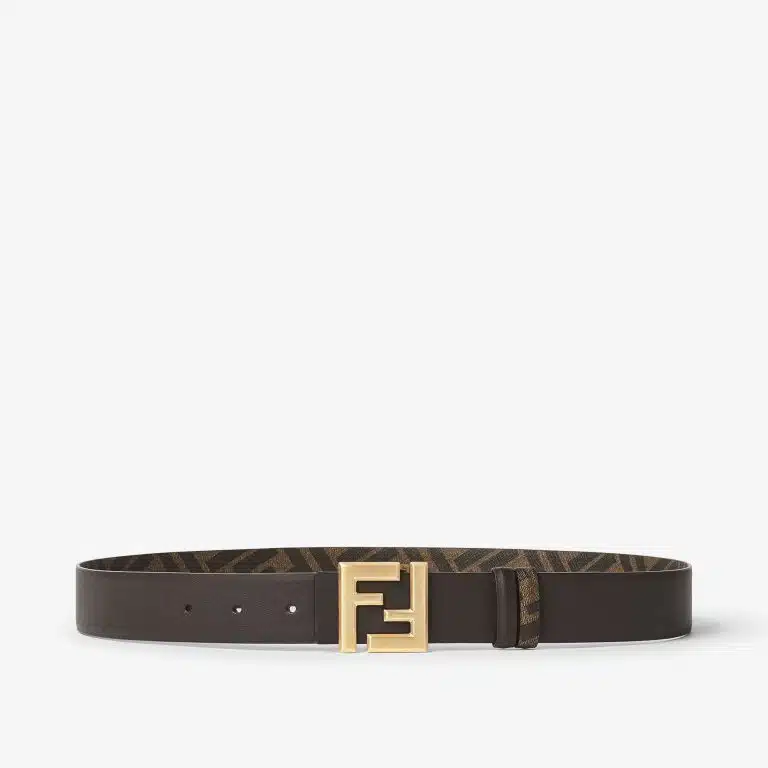 Reversible belt with thin FF Squared buckle. Made of smooth matt brown leather. Dark brown FF canvas underside. Metal accessories in a brushed gold finish.