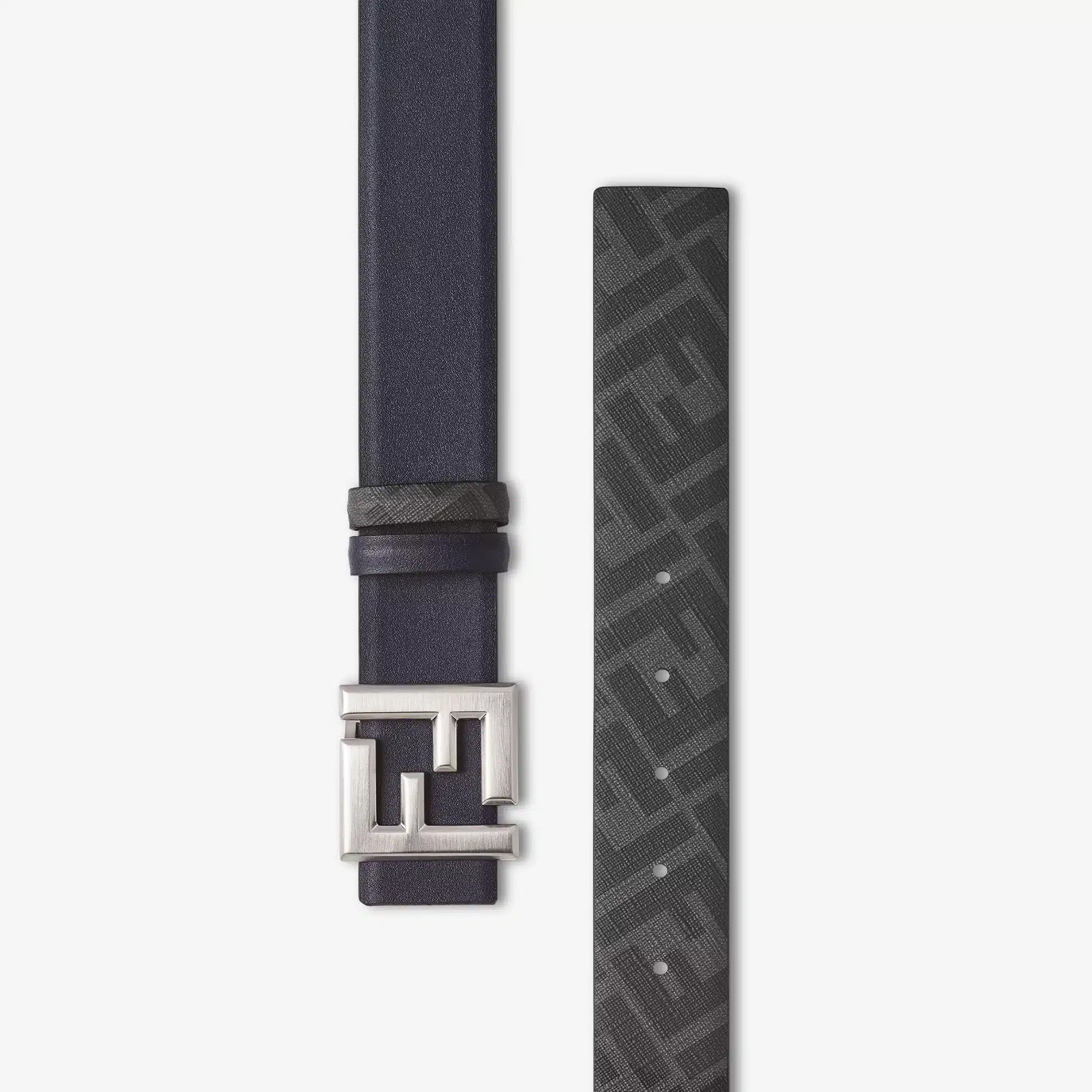 Reversible belt with thin FF Squared buckle. Made of smooth matt blue leather. Black FF Canvas lining. Brushed palladium-finish metalware.