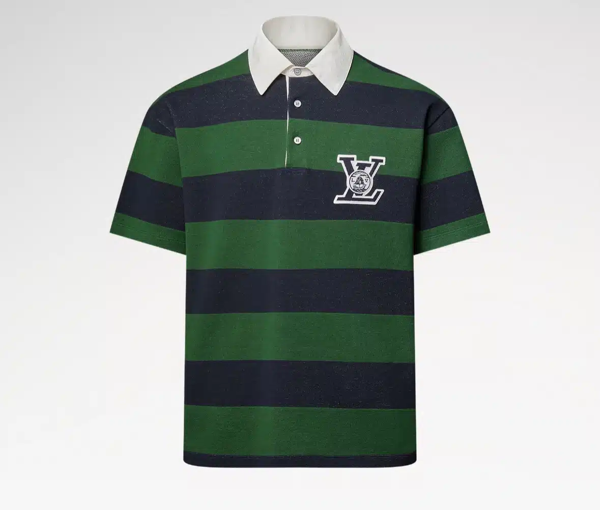 This graphic striped polo shirt in classic emerald and navy tones draws on this season’s college sports team inspiration. The cotton jersey knit features a contrasting woven Monogram jacquard collar and a textured LV patch on the chest inspired by university insignia. A contrasting white intarsia rowing boat motif is integrated on the back, completing this fresh and preppy style