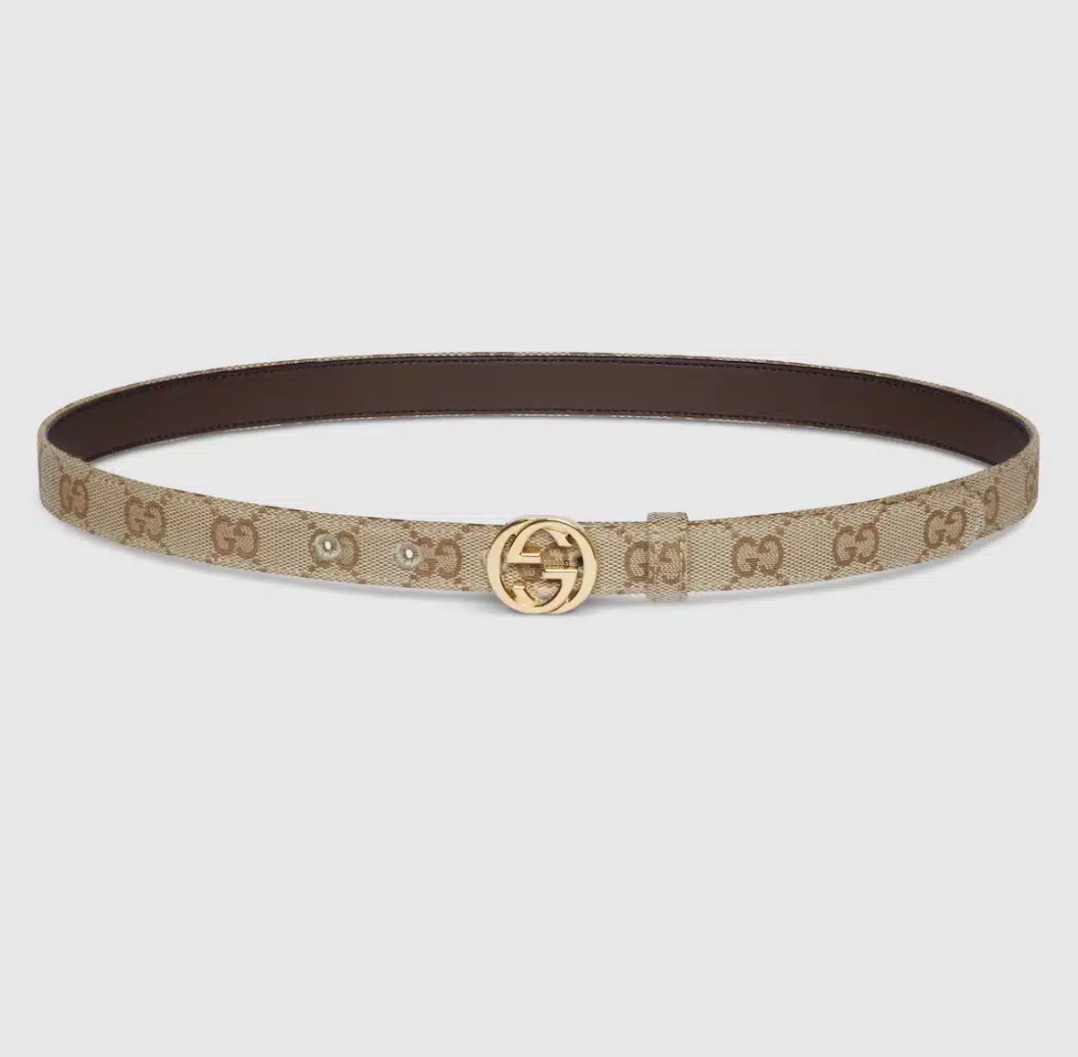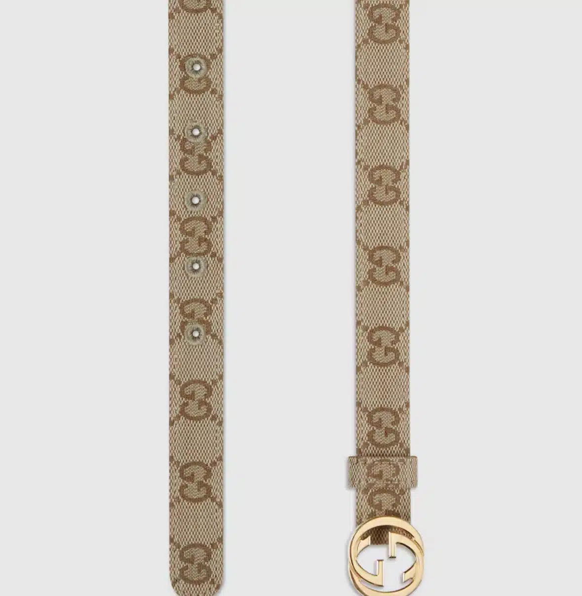 Introducing Spring Summer 2026. Women’s belts reinterpret the Interlocking G buckle with a sleek, flat profile, highlighting one of the House’s signature motifs. This thin belt has been crafted from sand GG canvas with gold-toned hardware.