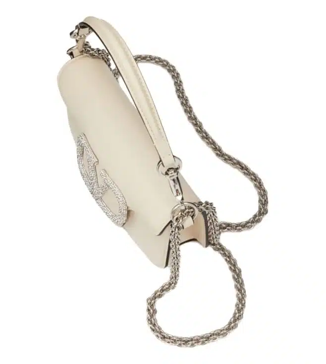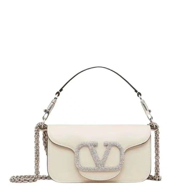 White leather vlogo signature silver-tone hardware swarovski crystal embellishment chain-link shoulder strap single rounded top handle foldover top concealed magnetic fastening. Products purchased from darveys are supported exclusively by the warranty/exchange policies of darveys and its partner boutiques. Brand owners and their channel partners are not responsible for exchange/warranty services for items purchased through darveys.