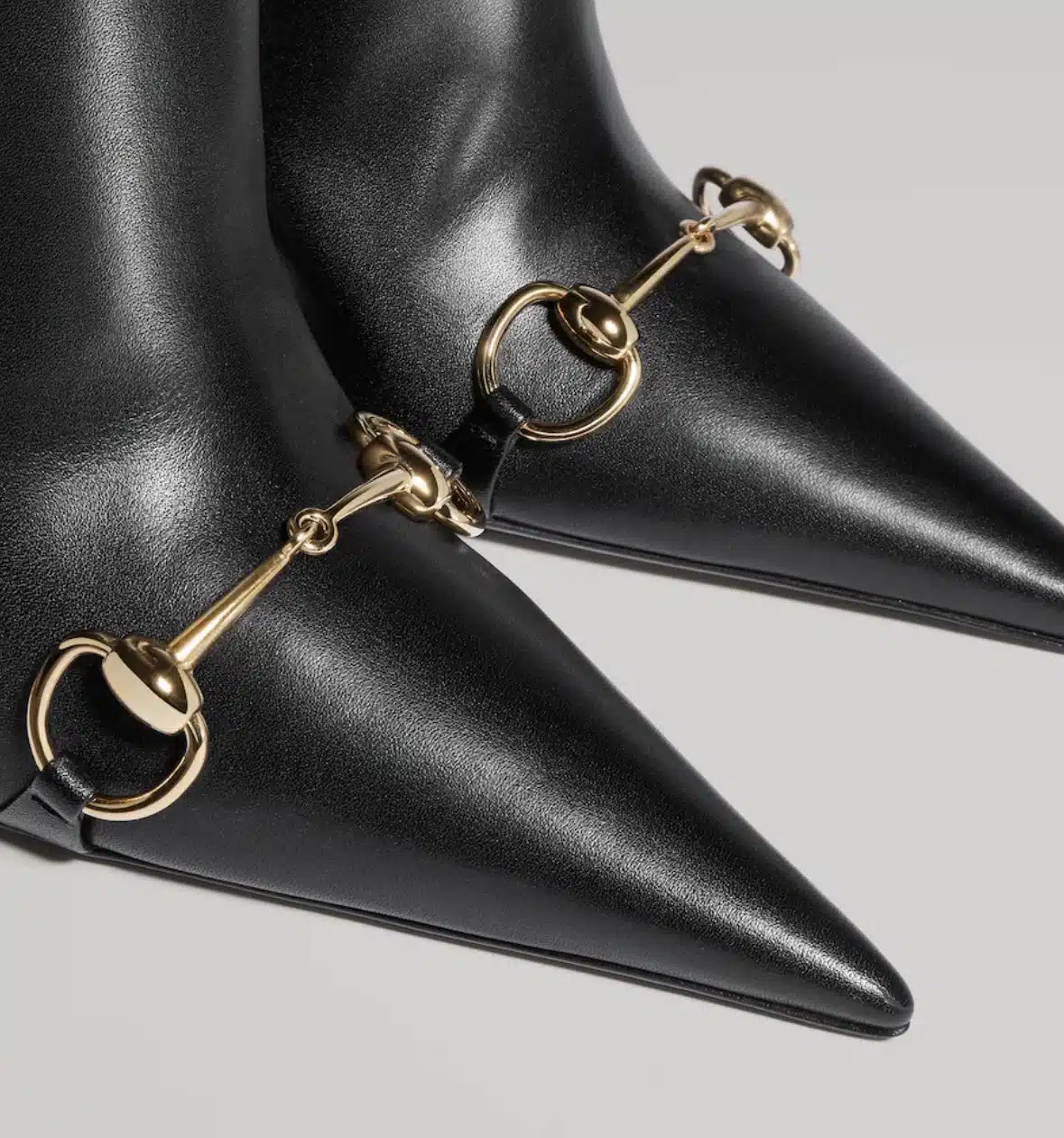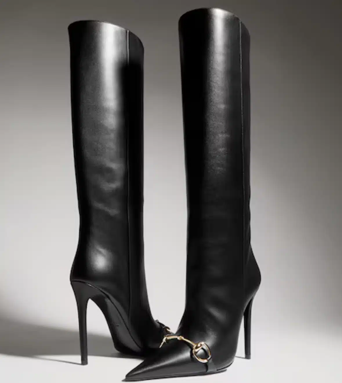 This style is part of the Gucci Primavera collection. The Donna makes its presence felt with striking clarity. The slip-on boot reaches just under the knee, highlighting a point toe and stiletto heel in a sensual design, accented with the emblematic Horsebit in gold-toned finish for a signature touch.